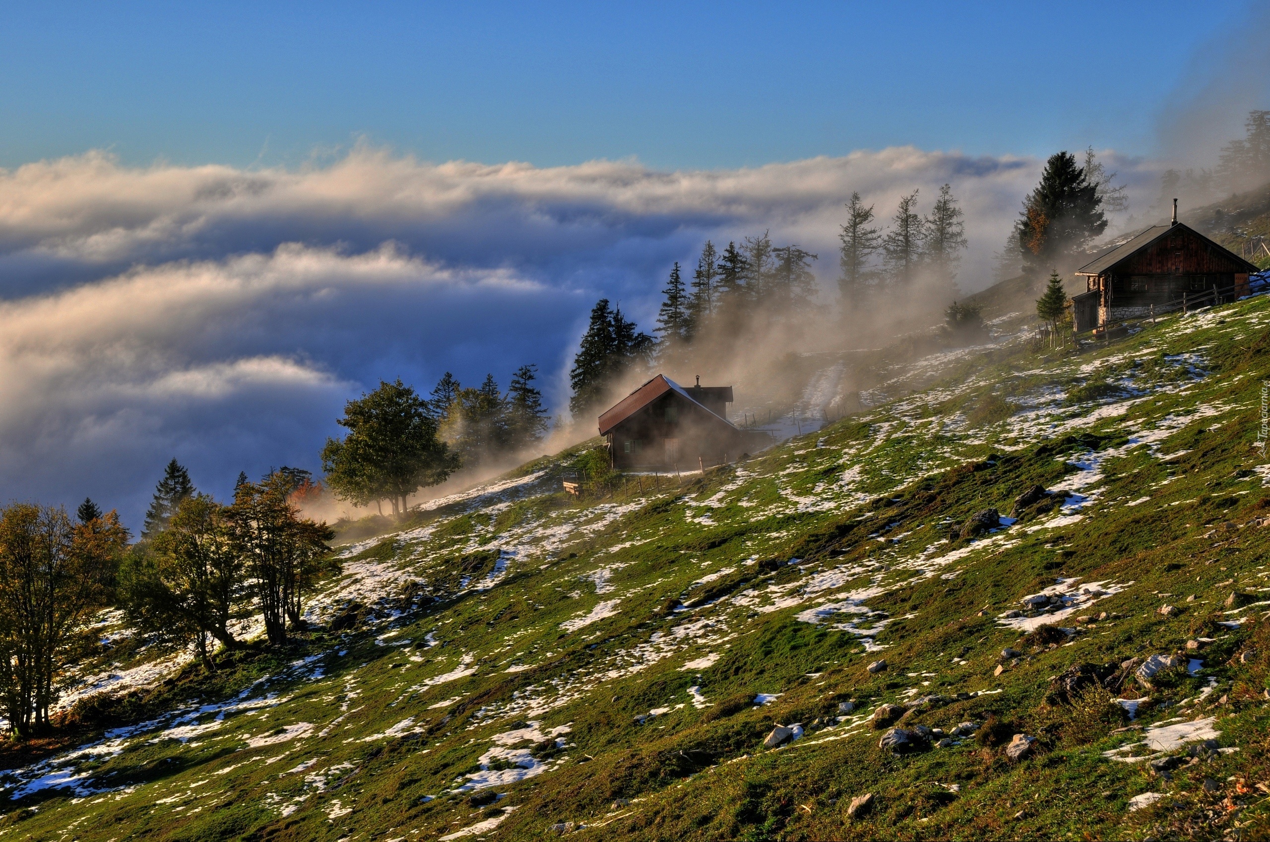 Edytor tapety: Góry, Domki, Drzewa, Mgła