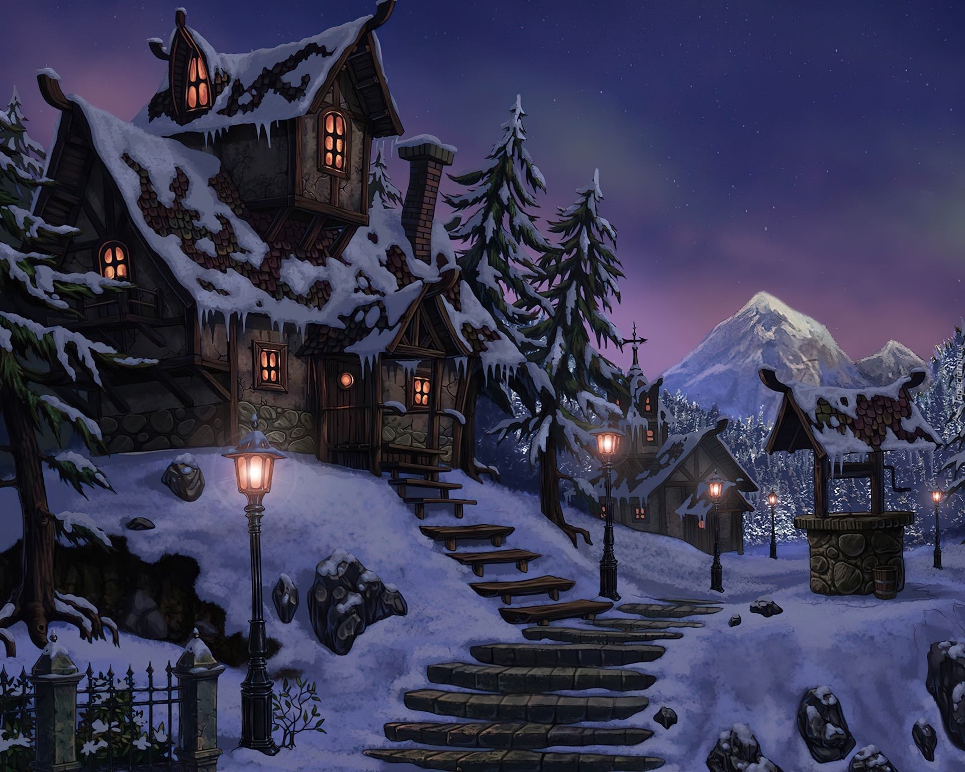Edytor tapety: Zima, Fantasy, Góry, Domek, Studnia, Schody, Latarnie