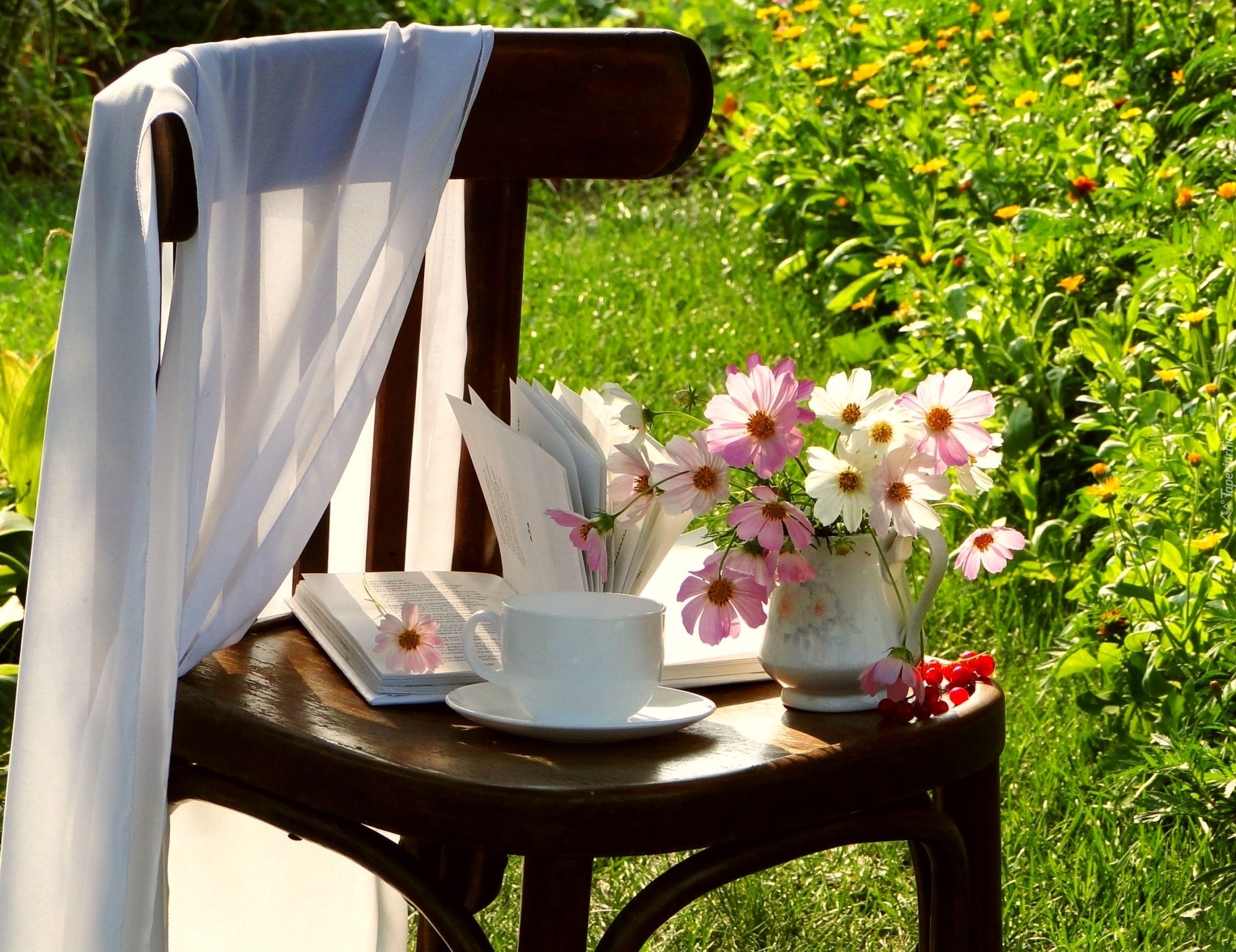 Edytor tapety: Kwiaty, Kosmea, Książka, Krzesło, Ogród