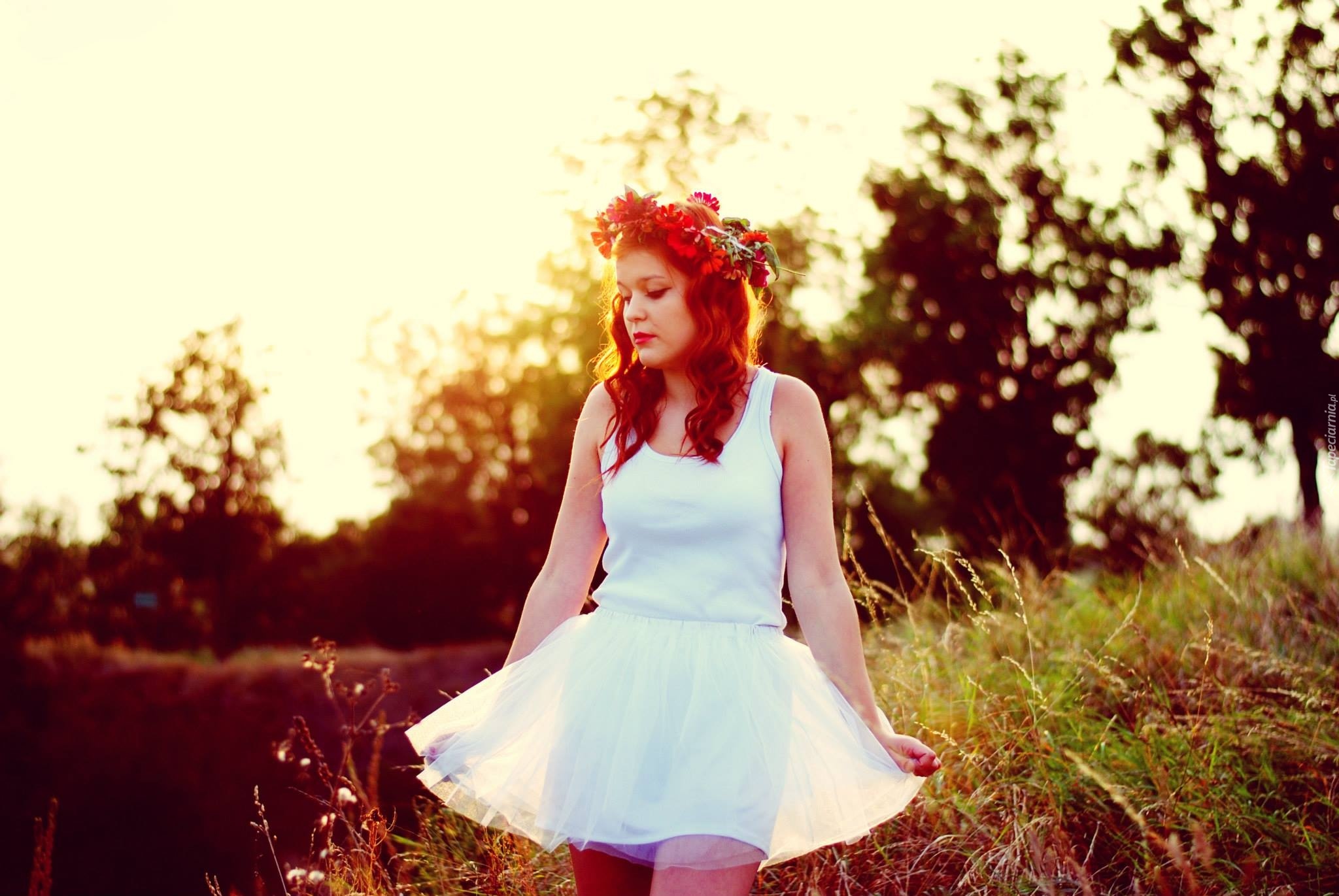 Edytor tapety: Kobieta, Ruda, Wianek, Biała, Sukienka