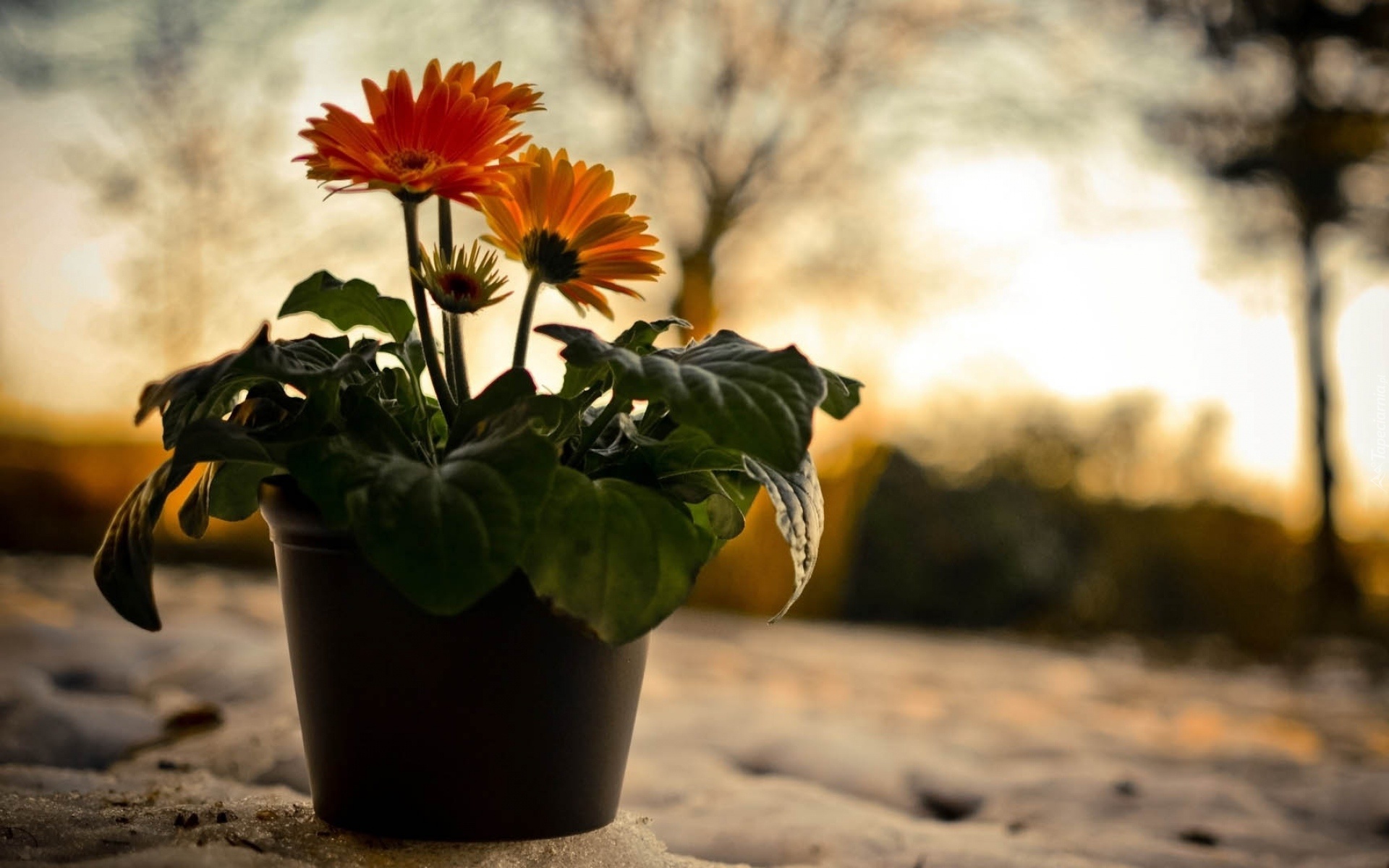 Edytor tapety: Śnieg, Doniczka, Gerbery, Cień