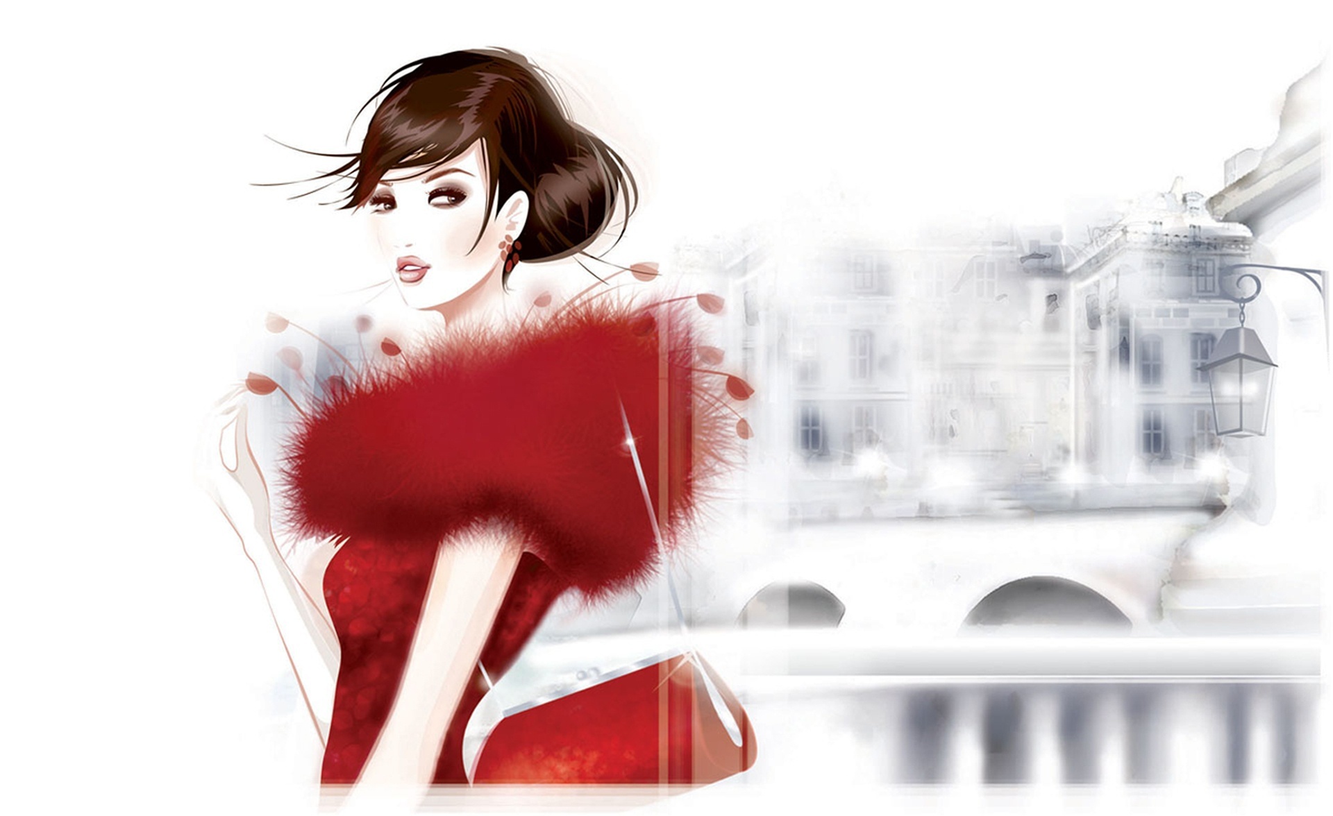 Edytor tapety: Grafika, 2D, Brunetka, Czerwona, Sukienka, Torebka