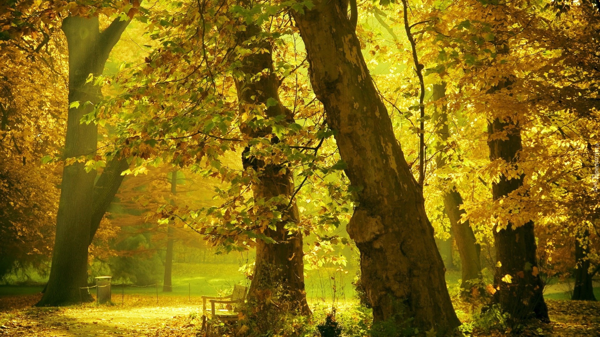 Edytor tapety: Park, Alejki, Ławki, Przebijające, Światło, Jesień, Drzewo