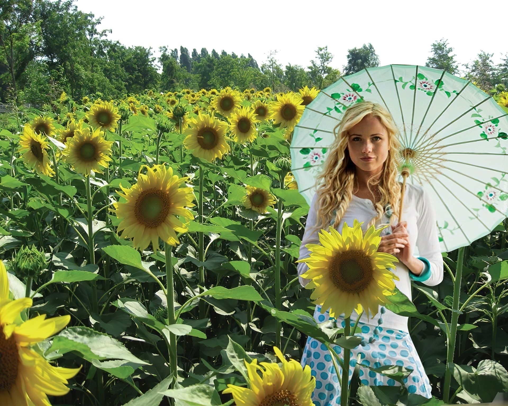 Edytor tapety: Kobieta, Blondynka, Pole, Słoneczniki, Parasolka