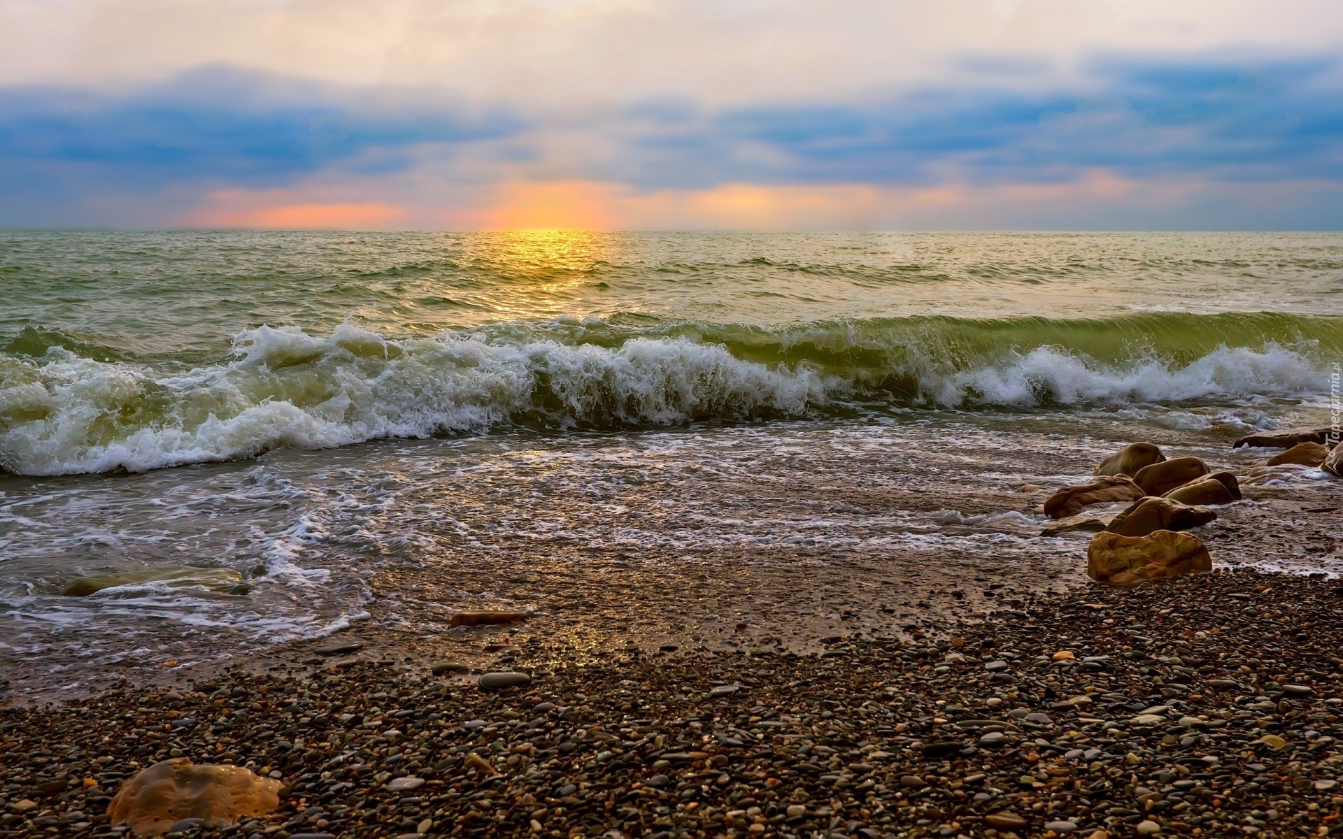 Edytor tapety: Zachód, Słońca, Morze, Kamienie, Fale, Brzeg