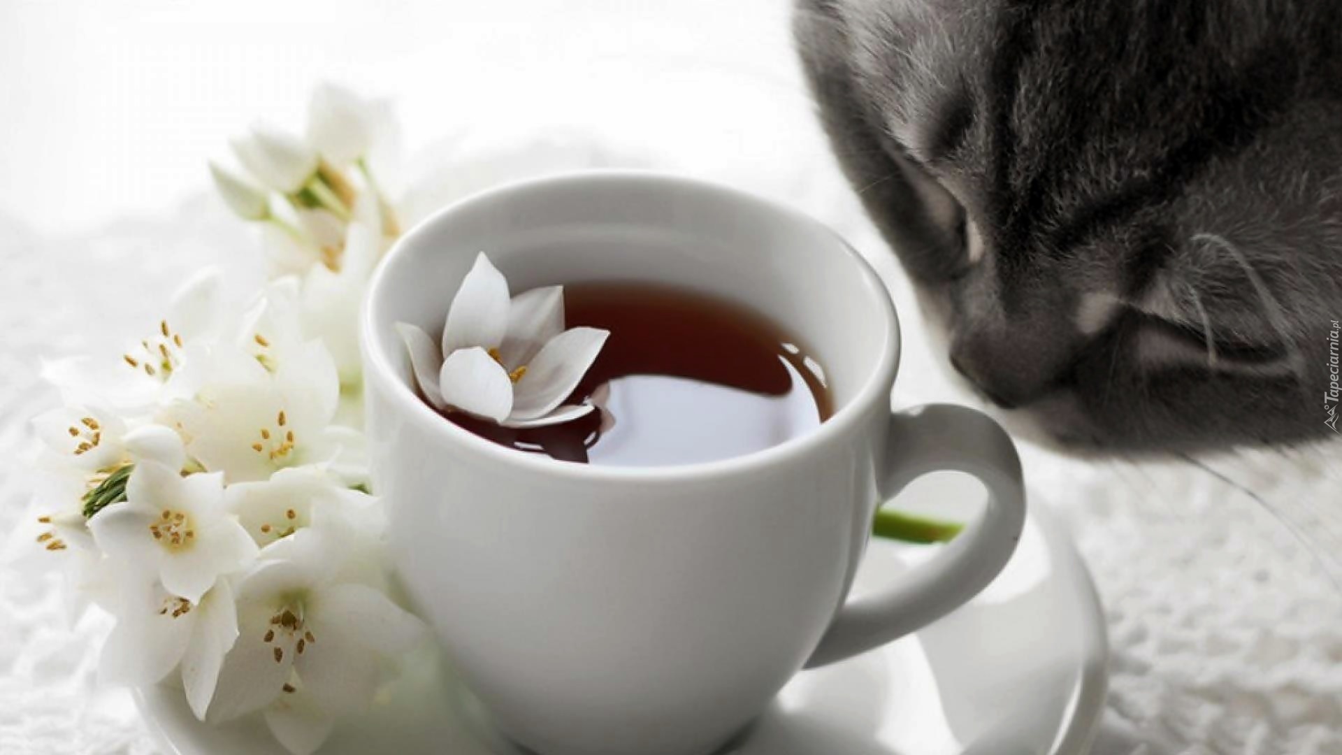 Edytor tapety: Filiżanka, Herbaty, Białe, Kwiatki, Pyszczek, Kota
