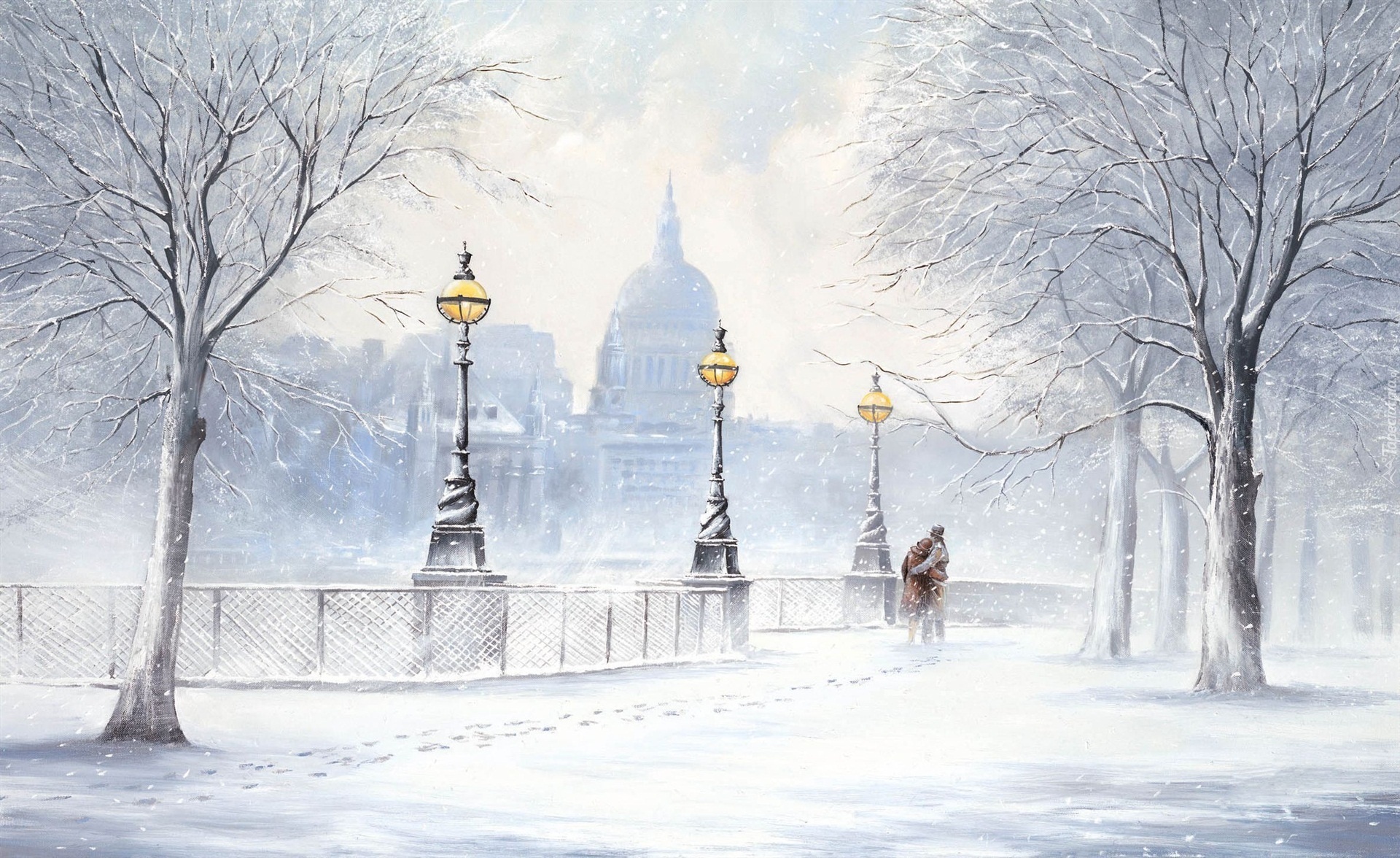Edytor tapety: Obraz, Zima, Śnieg, Zakochani, Drzewa, Zabytki, Lampy