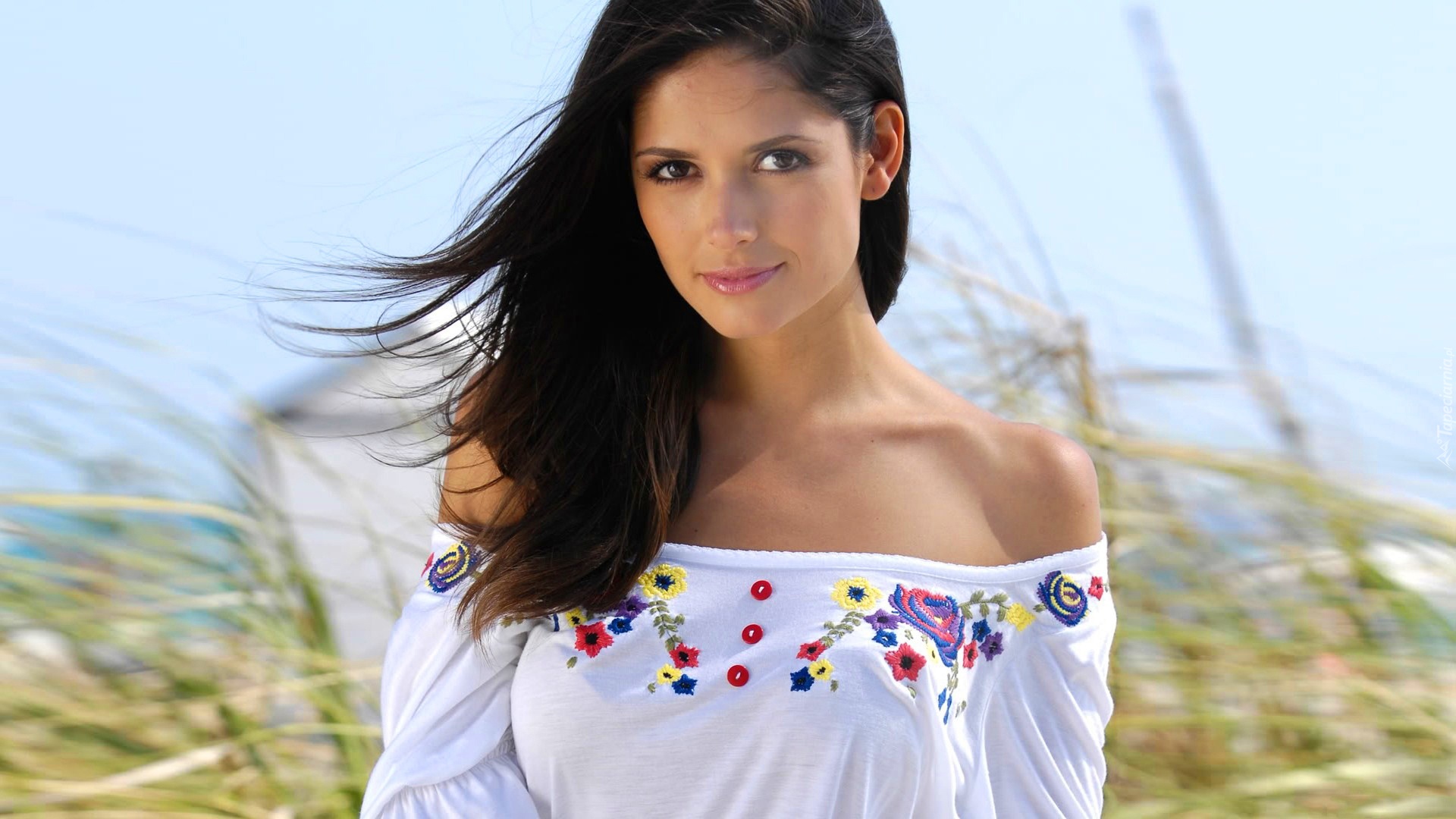 Edytor tapety: Kobieta, Brunetka, Biała, Haftowana, Bluzka, Odkryte, Ramiona