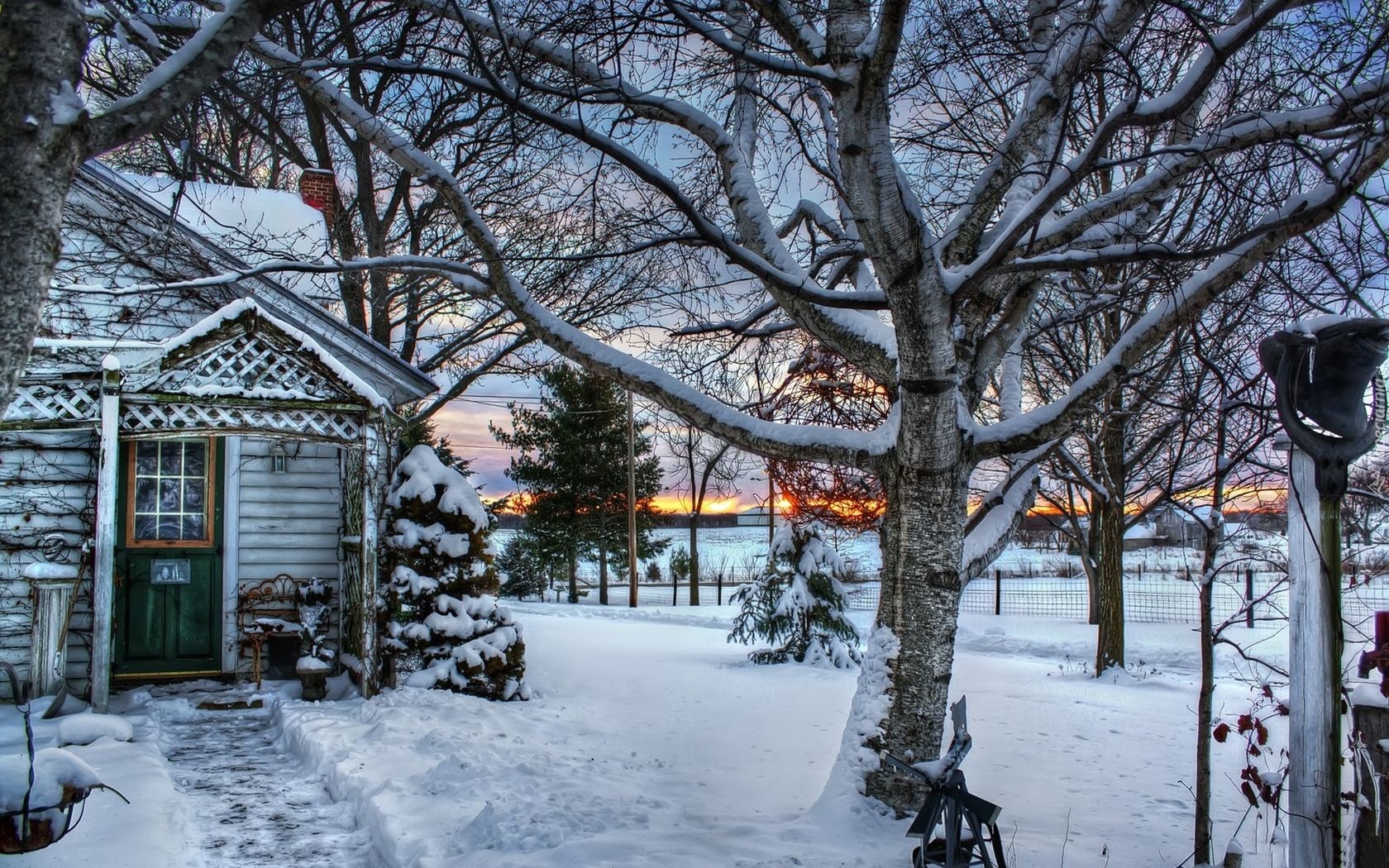Edytor tapety: Dom, Farmy, Pola, Zachód, Słońca, Zima