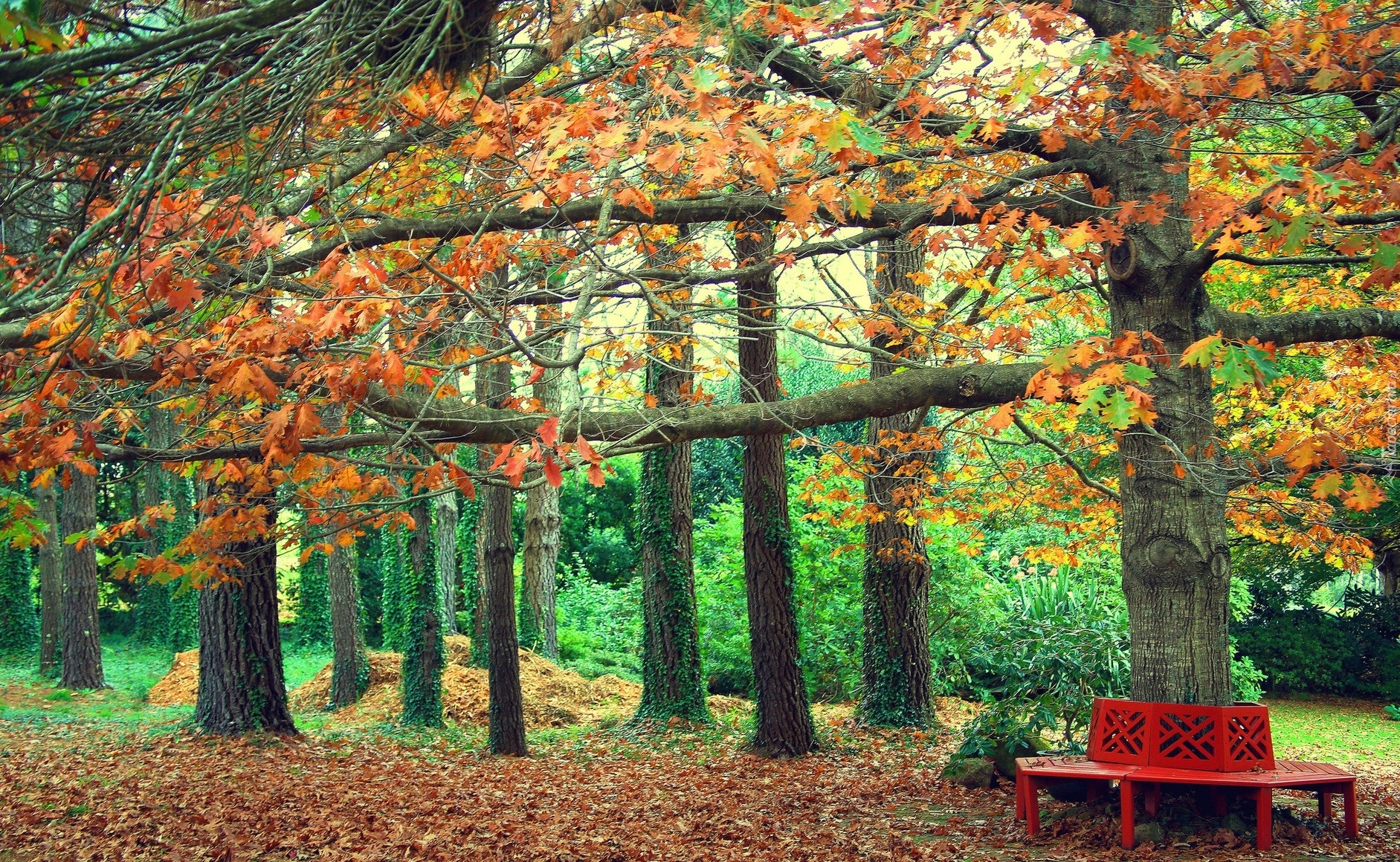 Edytor tapety: Park, Ławka, Drzewa, Liście, Jesień