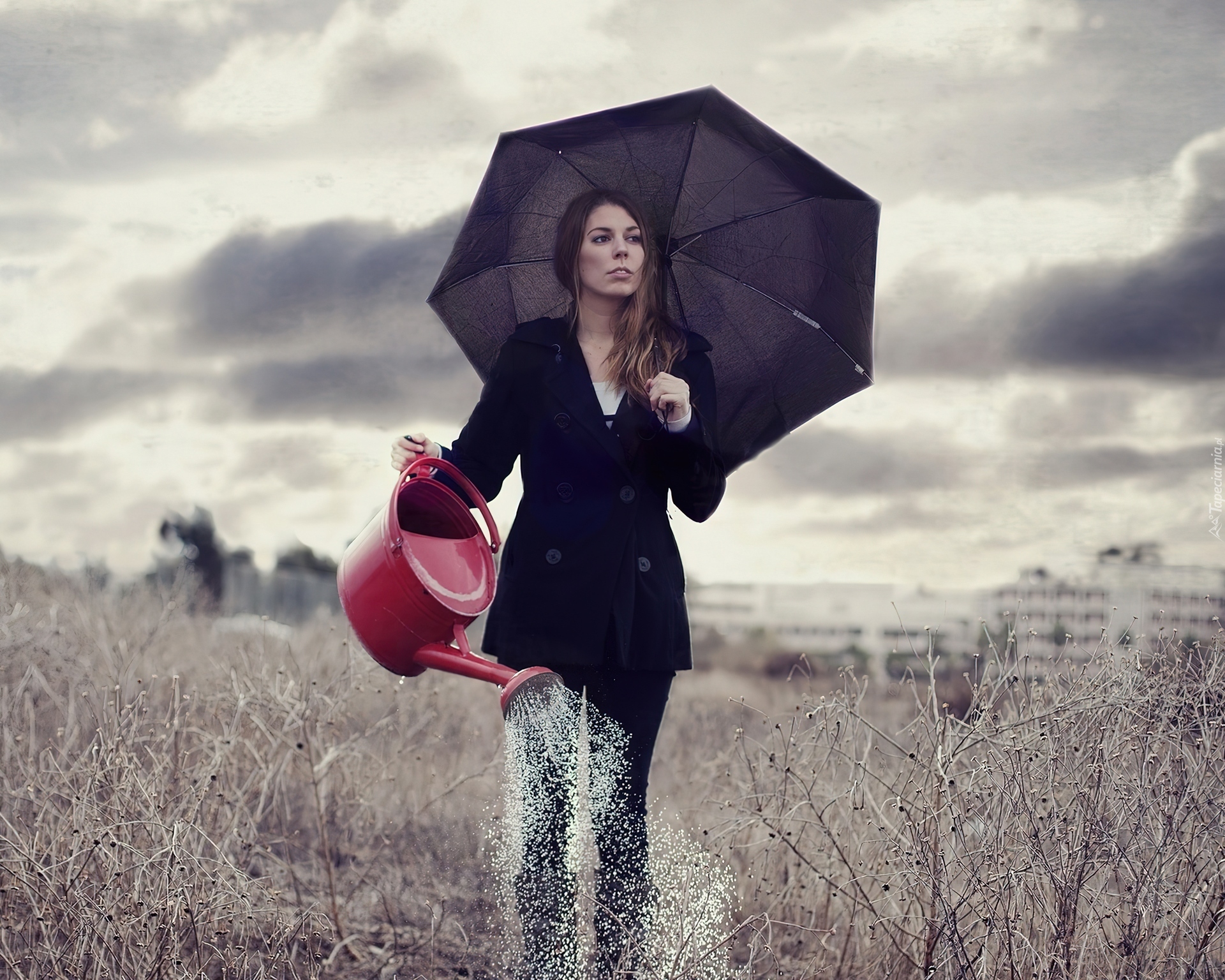 Edytor tapety: Kobieta, Pole, Czarna, Parasolka, Czerwona, Konewka, Woda