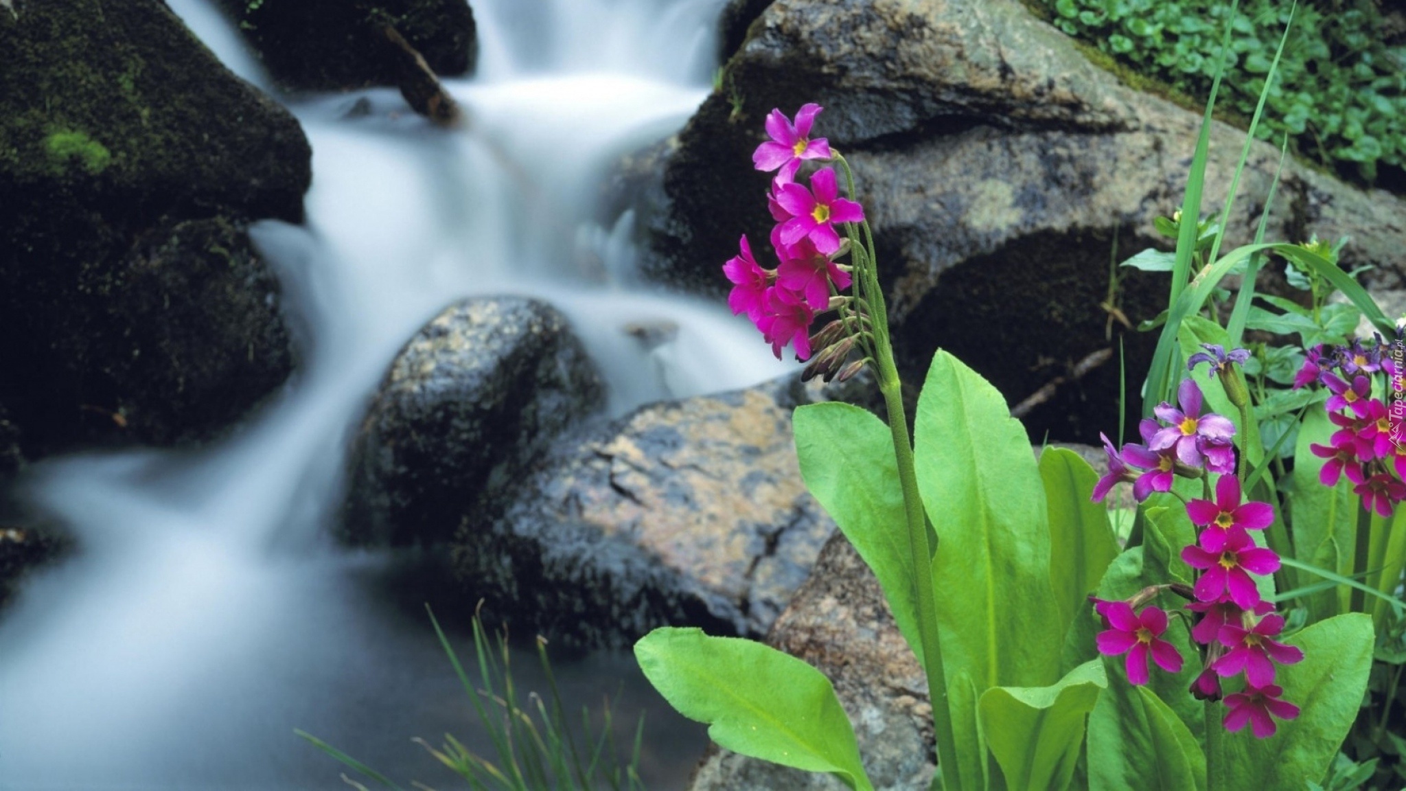 Edytor tapety: Wodospad, Kamienie, Różowe, Kwiaty, Rośliny