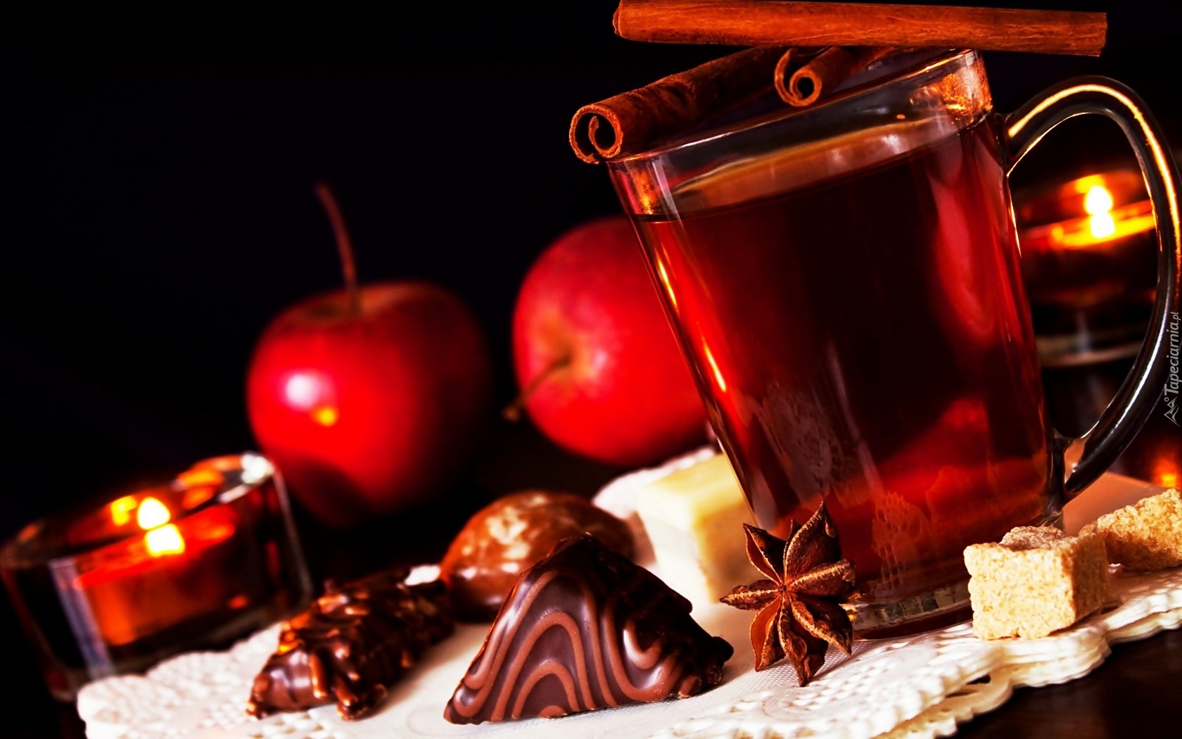 Edytor tapety: Szklanka, Herbaty, Jabłka, Słodycze, Przyprawy, Rozmycie