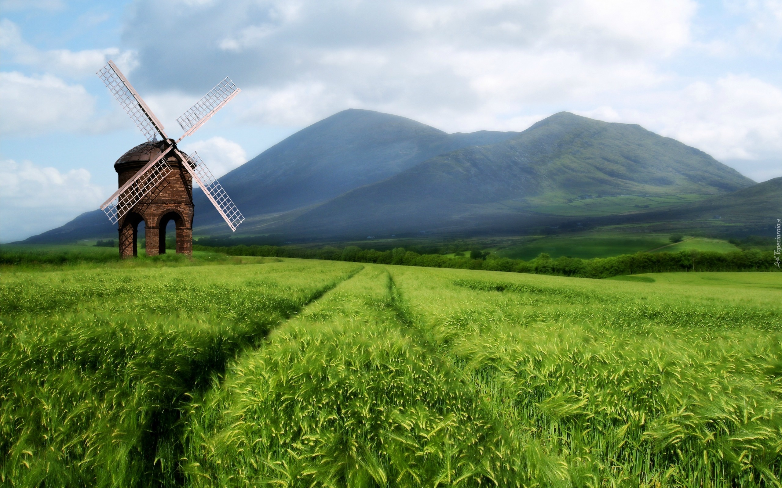 Edytor tapety: Wiatrak, Pola, Zboże, Góry, Lasy