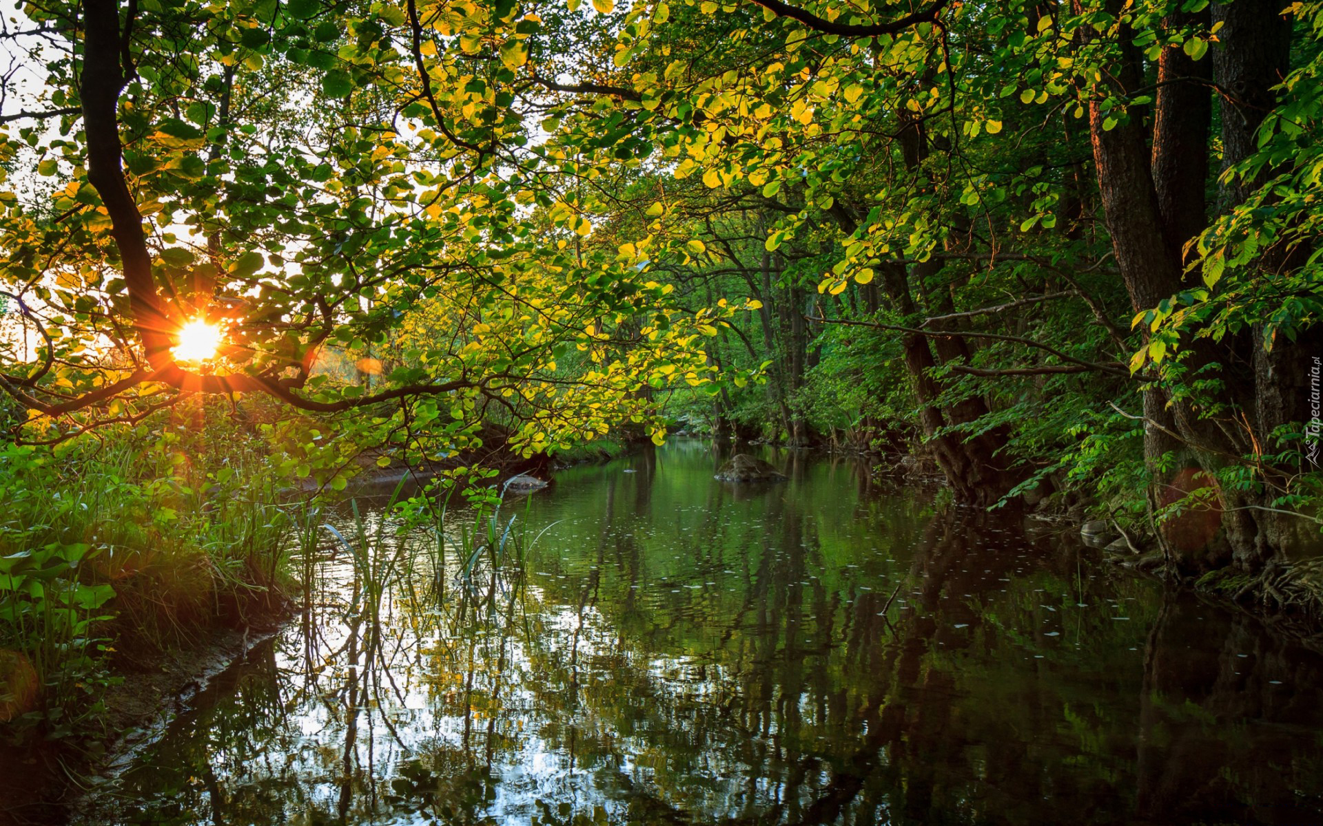 Edytor tapety: Las, Rzeka, Promienie, Słońca