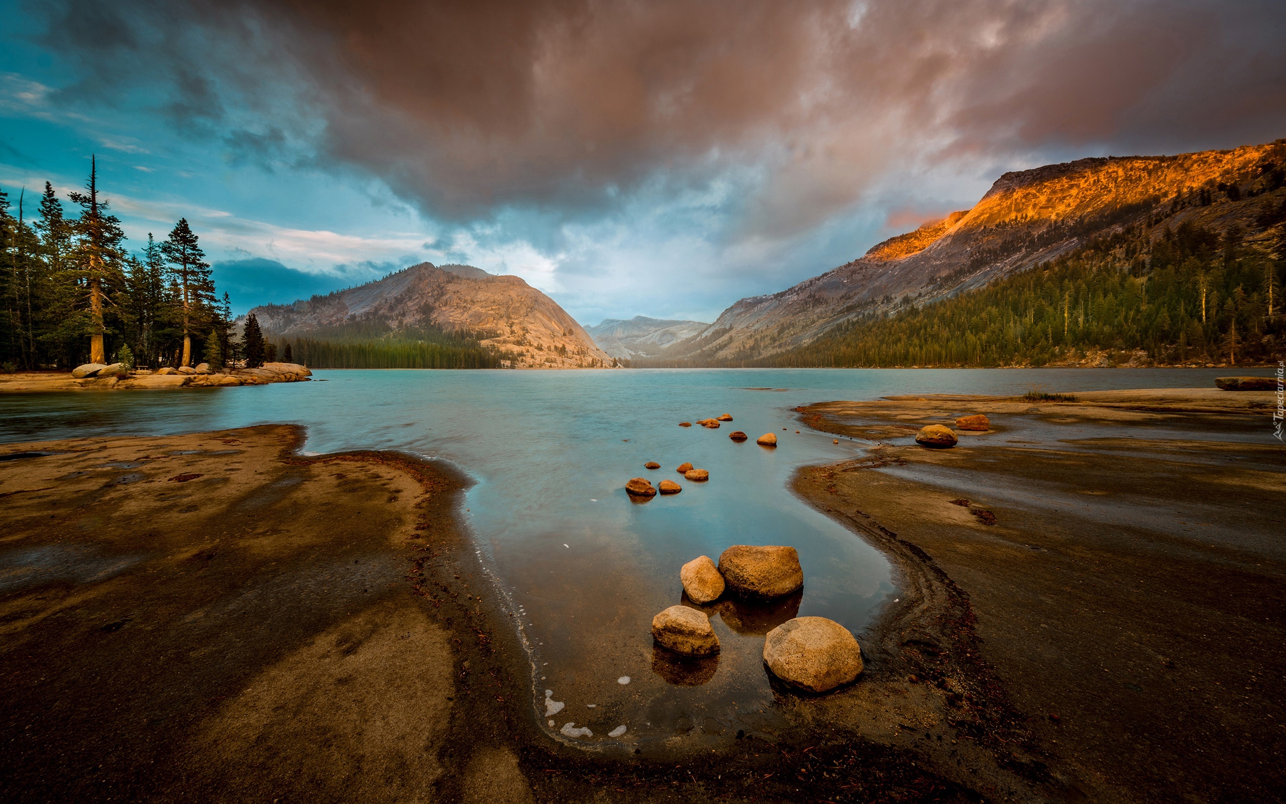 Edytor tapety: Jezioro, Góry, Kamienie, Drzewa
