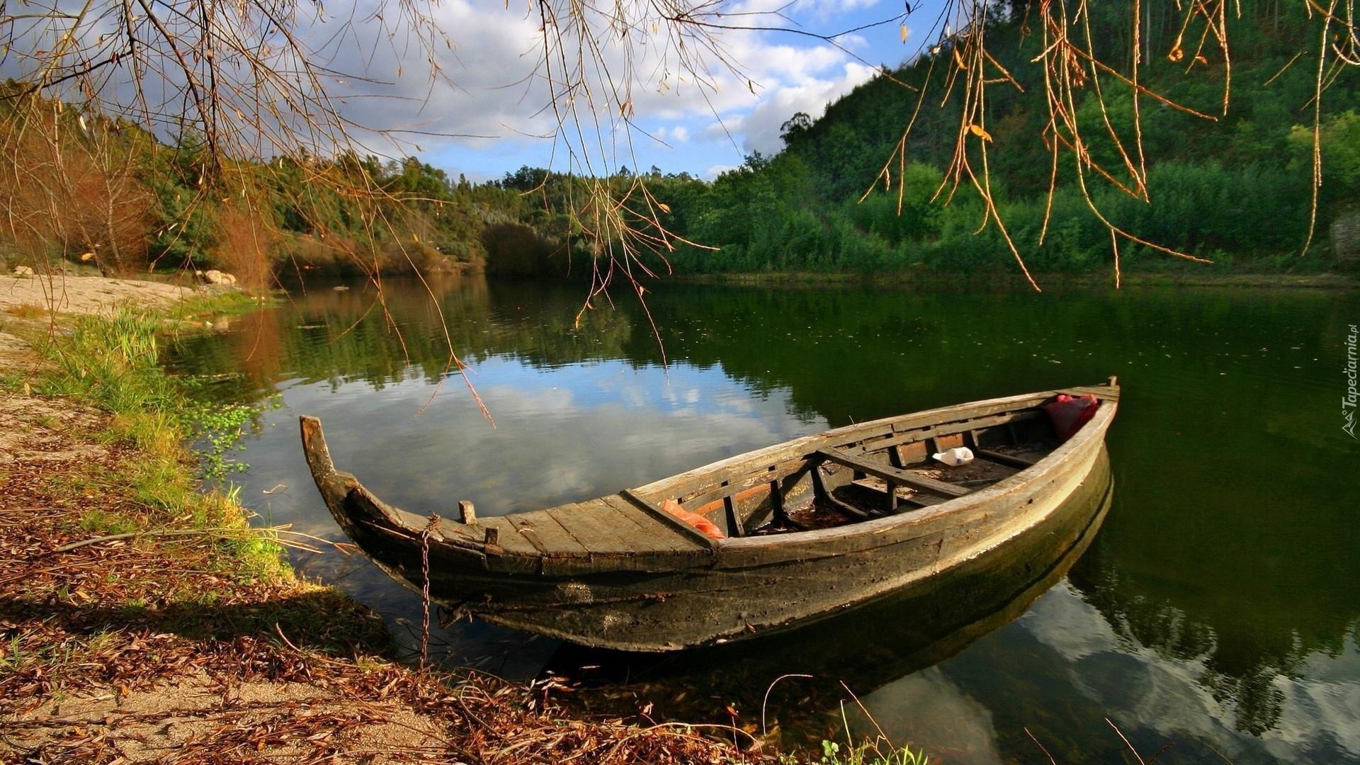 Edytor tapety: Jezioro, Brzeg, Łódka, Drzewa