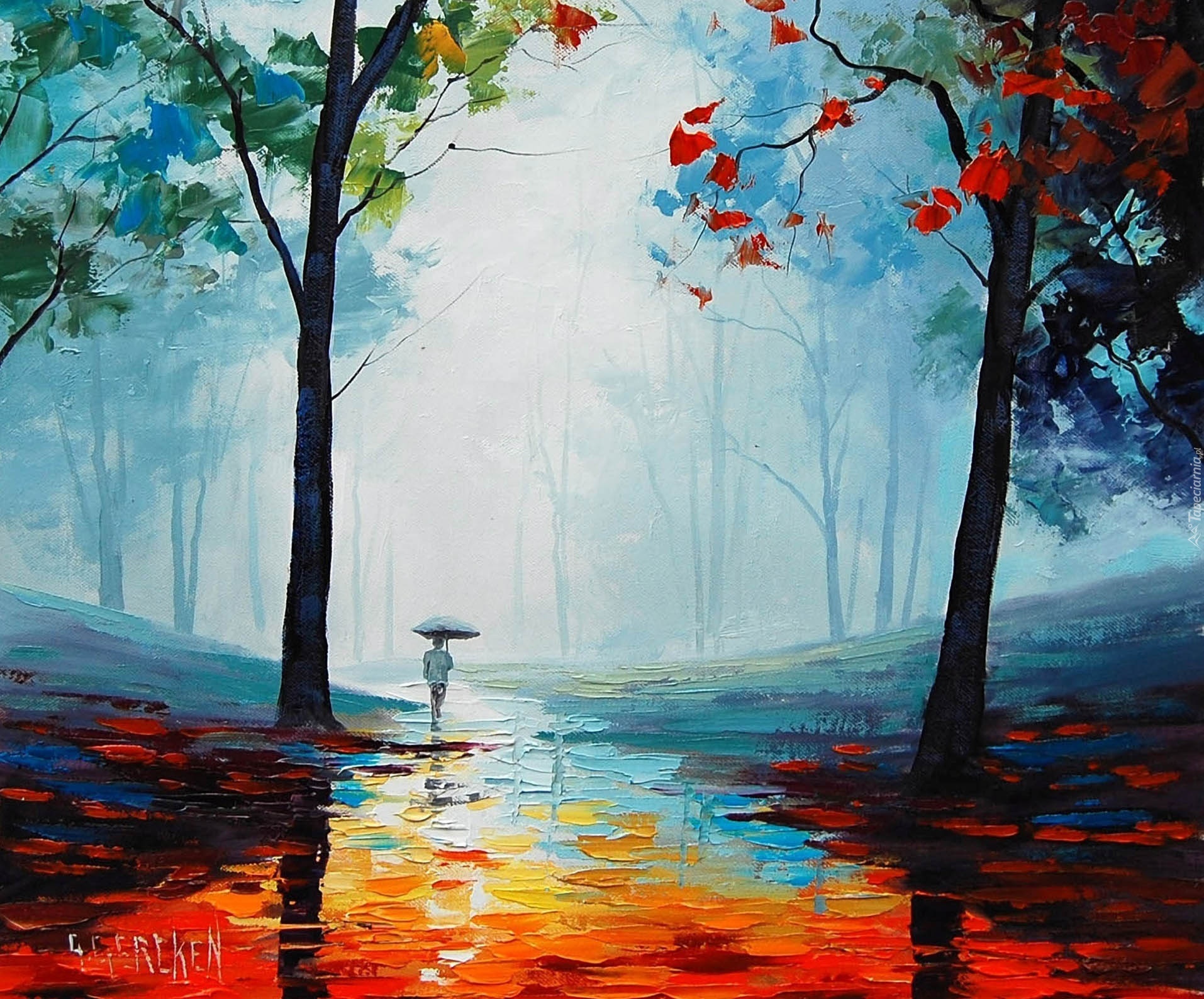 Edytor tapety: Malarstwo, Obraz, Park, Przechodzień, Parasol, Drzewa