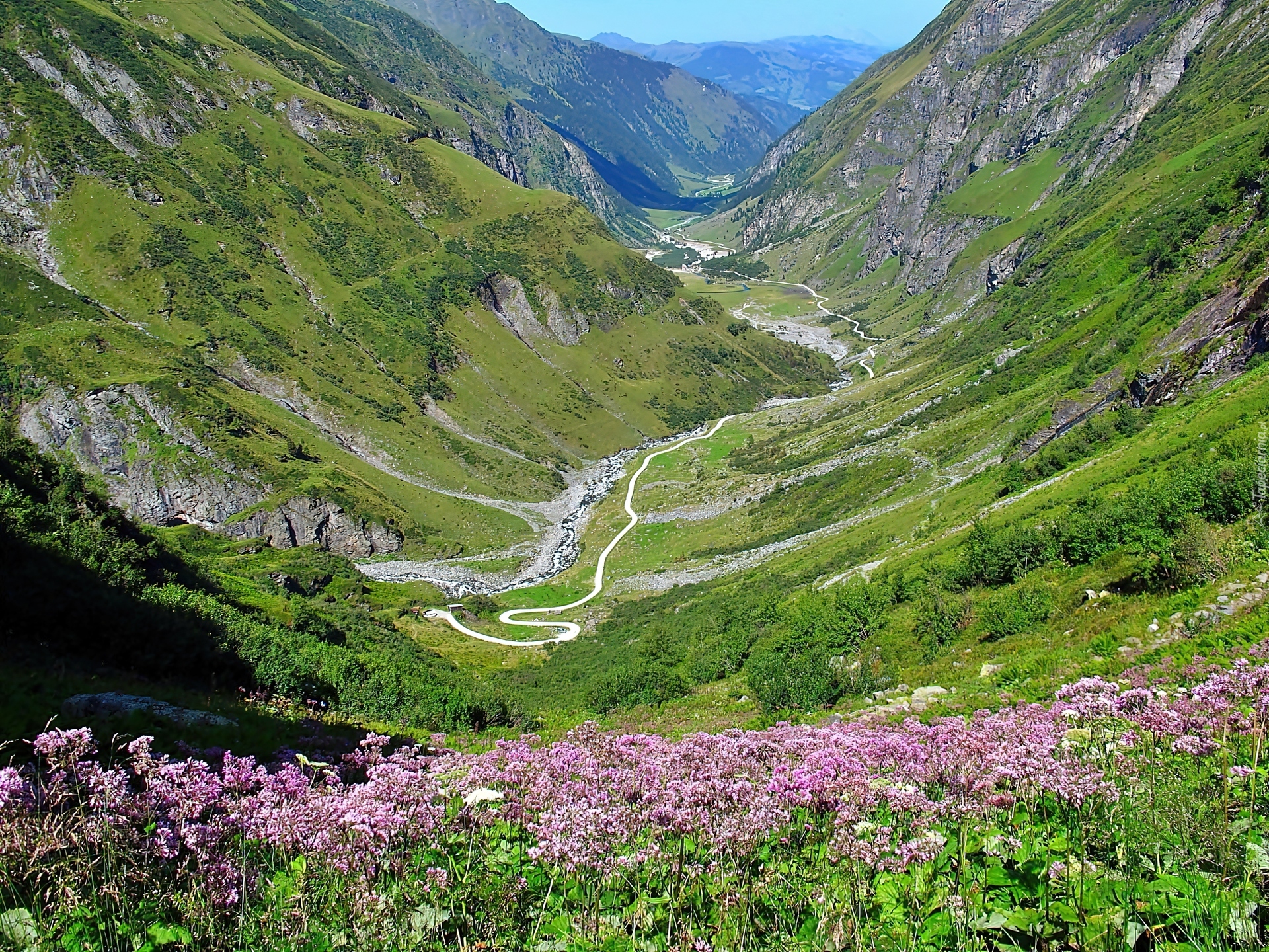Edytor tapety: Góry, Wąwóz, Droga, Łąki, Kwiaty
