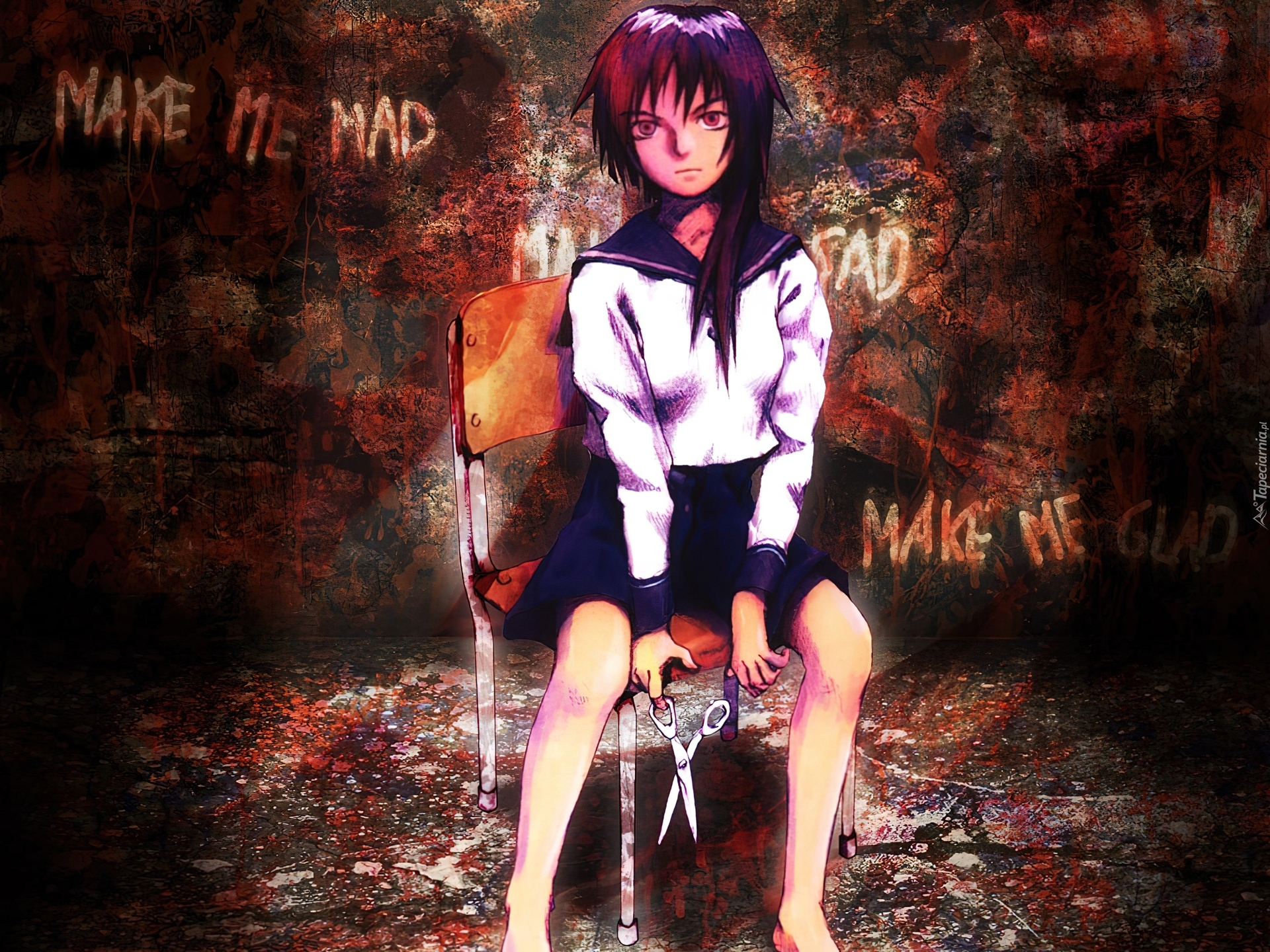 Edytor tapety: Serial Experiments Lain, krzesło, nożyczki