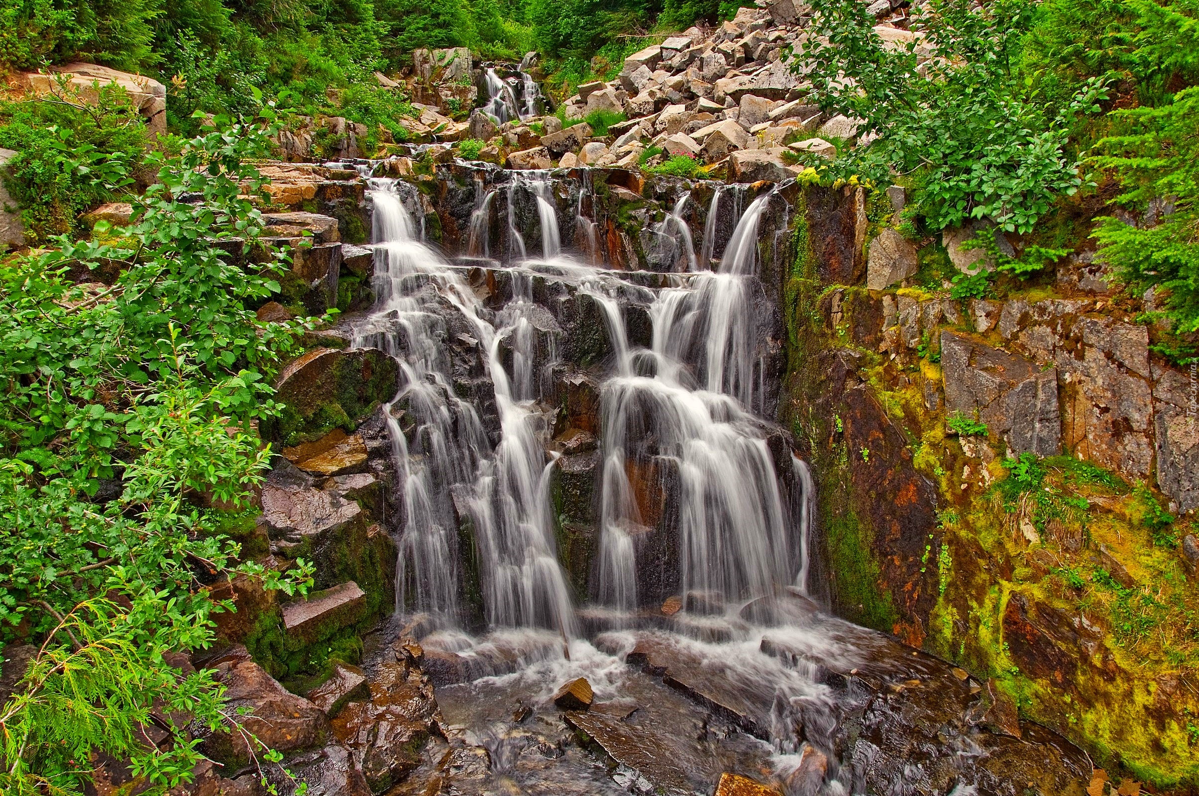 Edytor tapety: Wodospad, Kamienie, Las