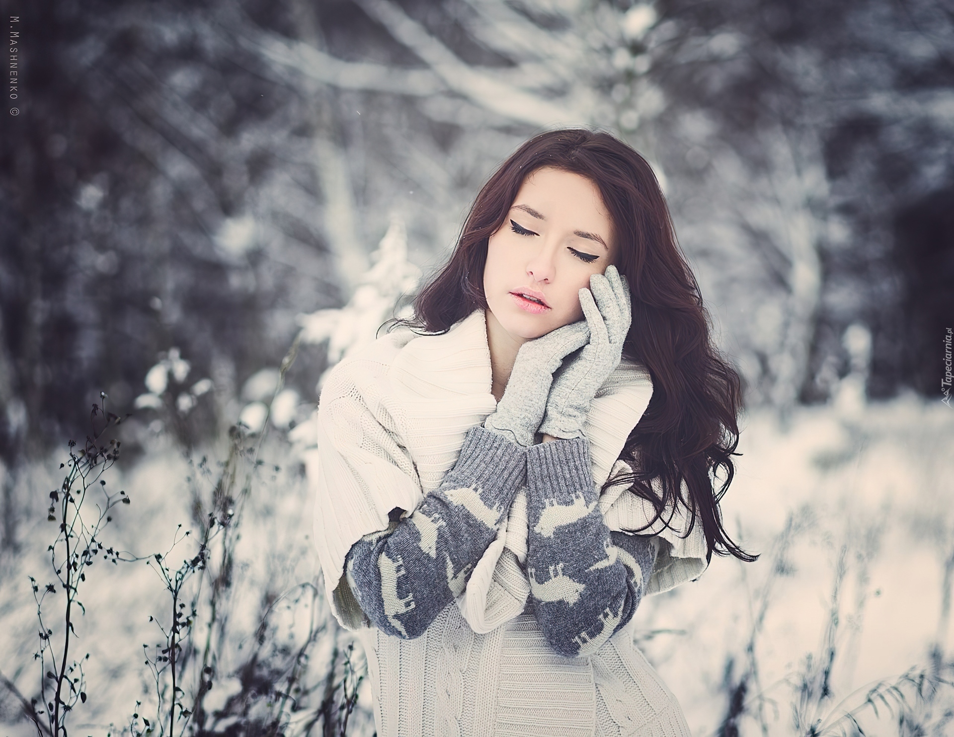 Edytor tapety: Brunetka, Kobieta, Zima, Ośnieżone, Rośliny