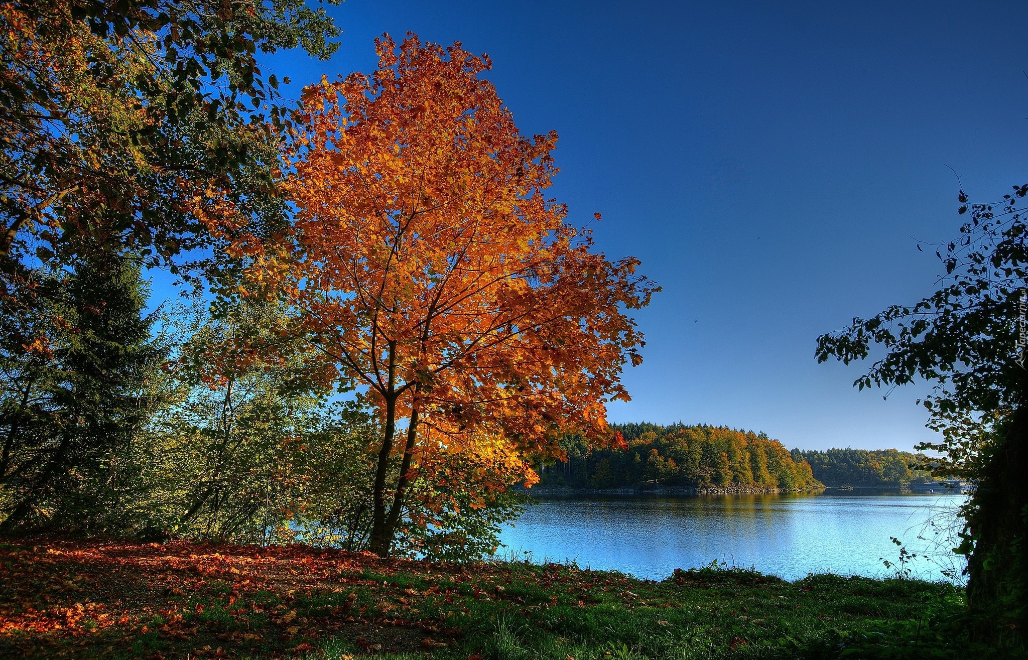 Edytor tapety: Jezioro, Lasy, Kolorowe, Drzewa, Liście, Jesień