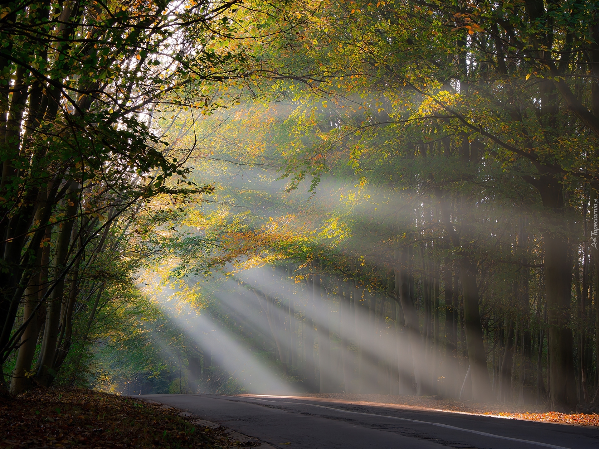 Edytor tapety: Las, Jesień, Przebijające, Słońce, Promienie