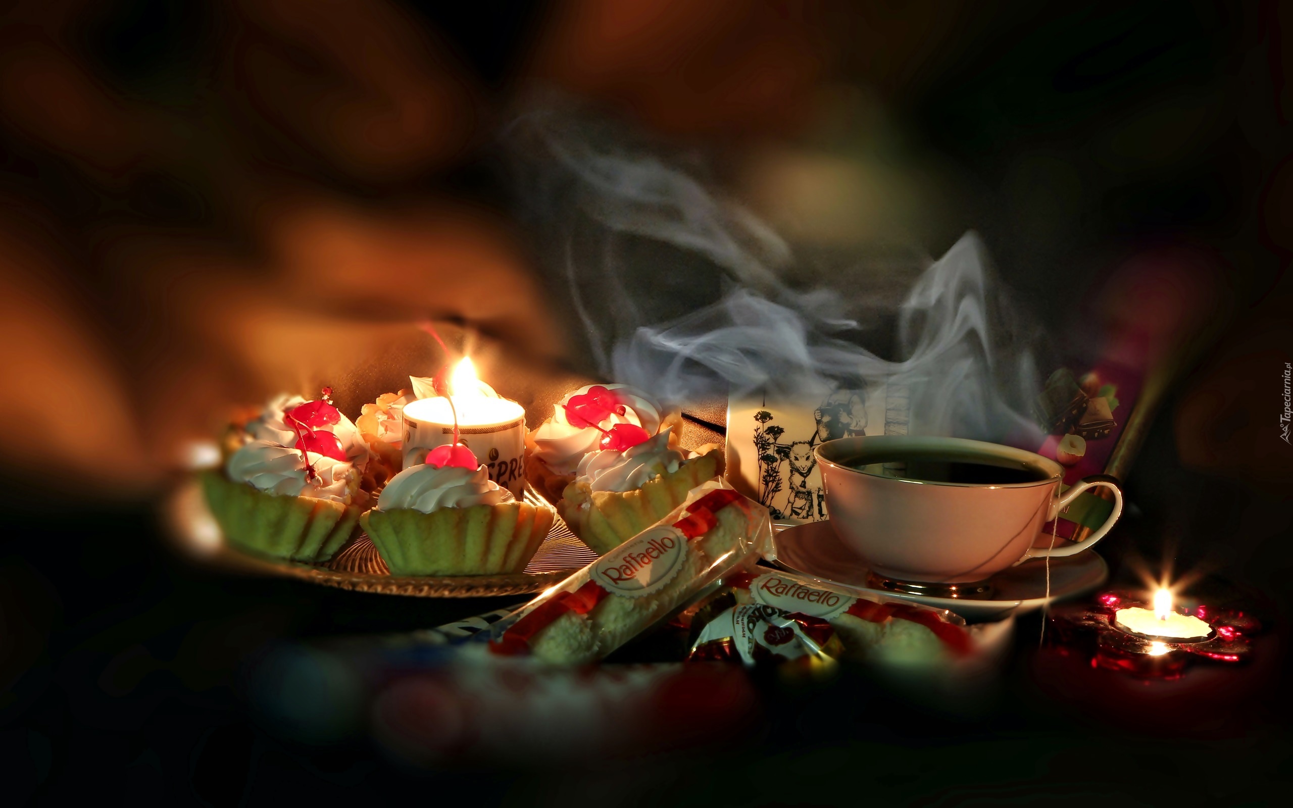 Edytor tapety: Gorąca, Herbata, Babeczki, Rafaello, Świece, Rozmycie