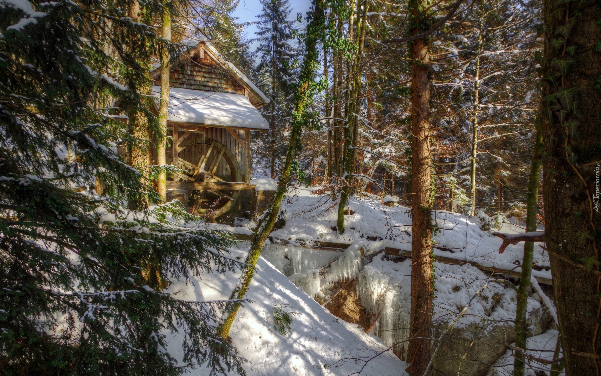 Edytor tapety: Młyn Wodny, Las, Zima