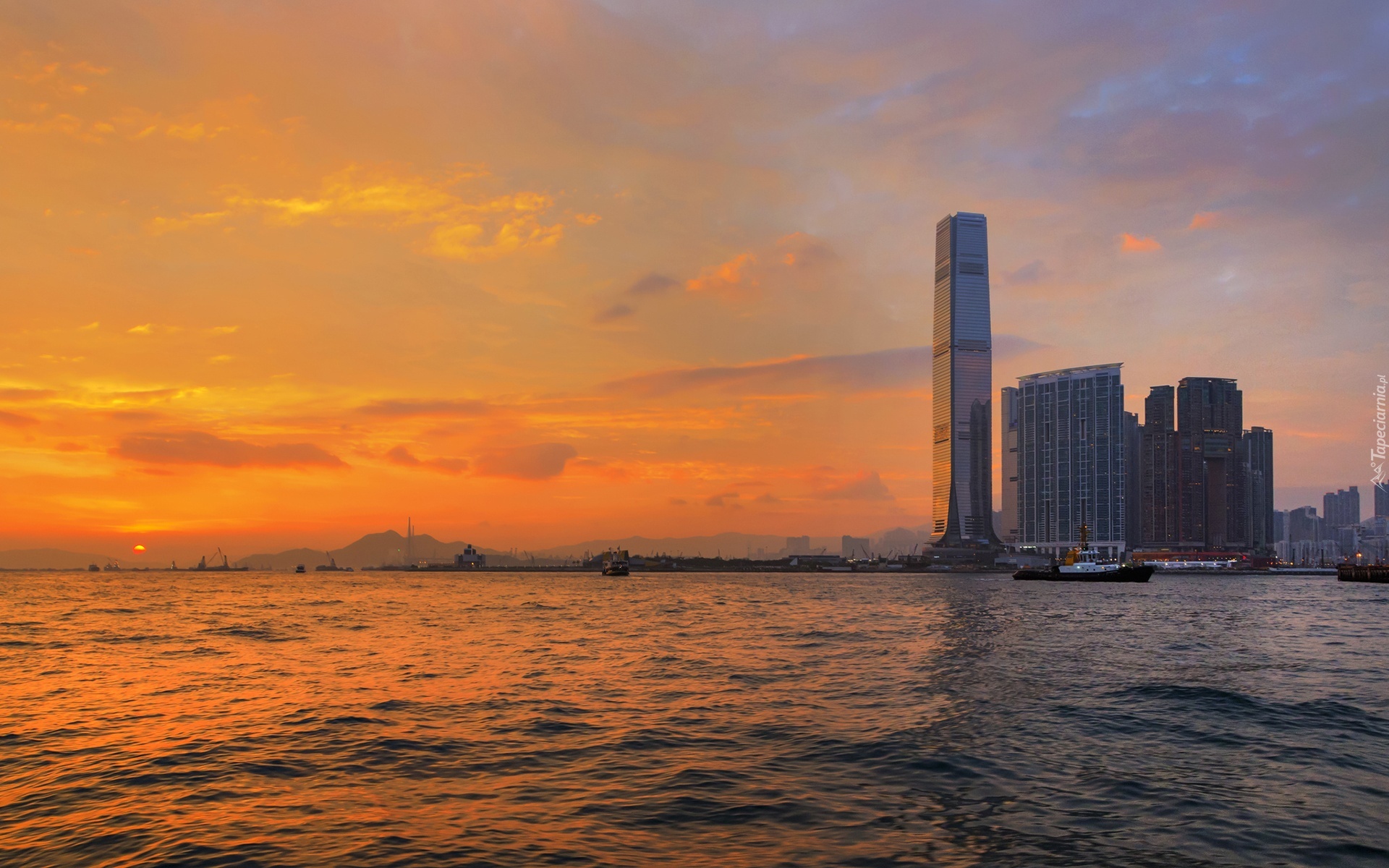 Edytor tapety: Morze, Zachód Słońca, Wieżowce