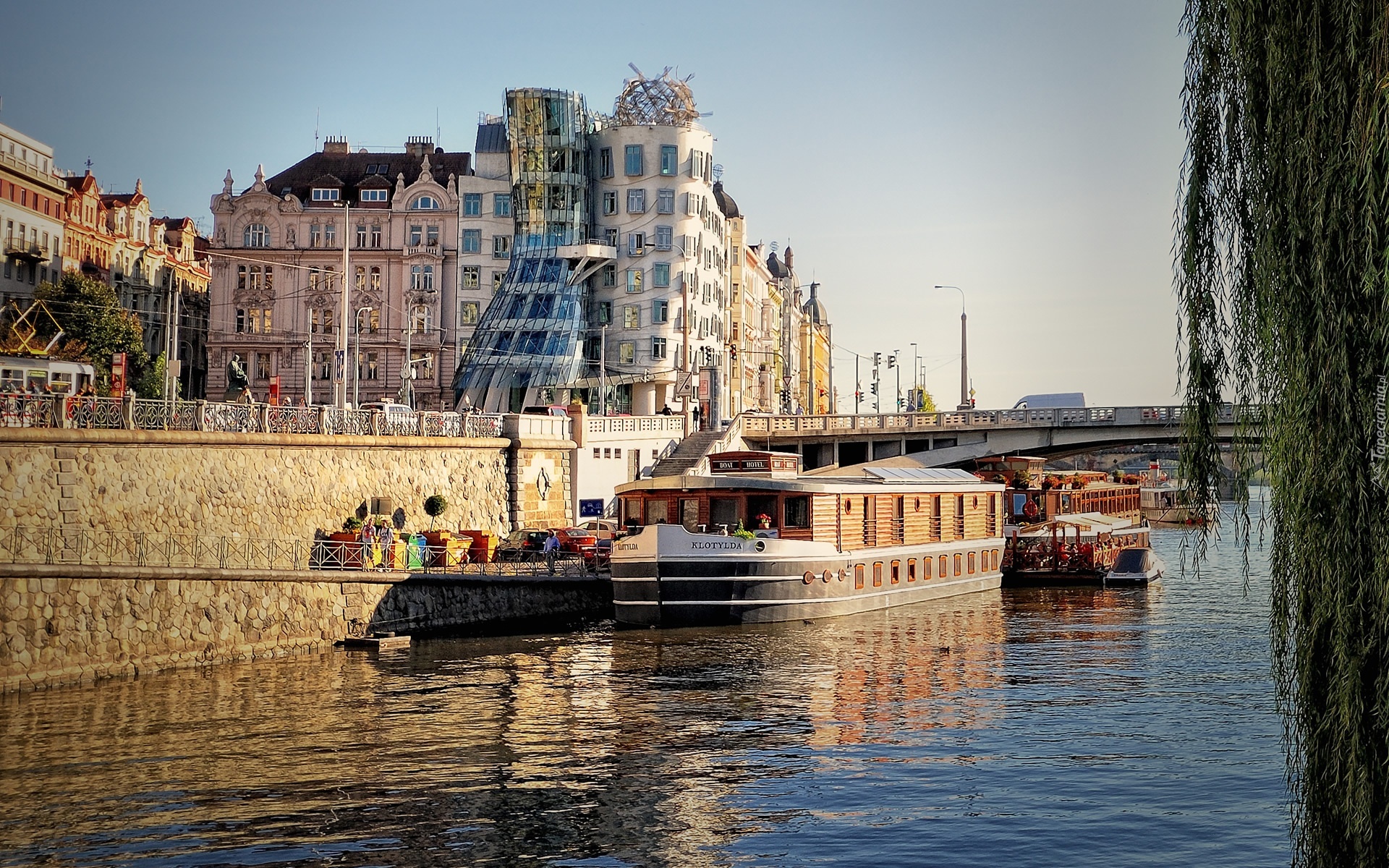 Edytor tapety: Krzywe, Domy, Praga, Rzeka, Most, Barki