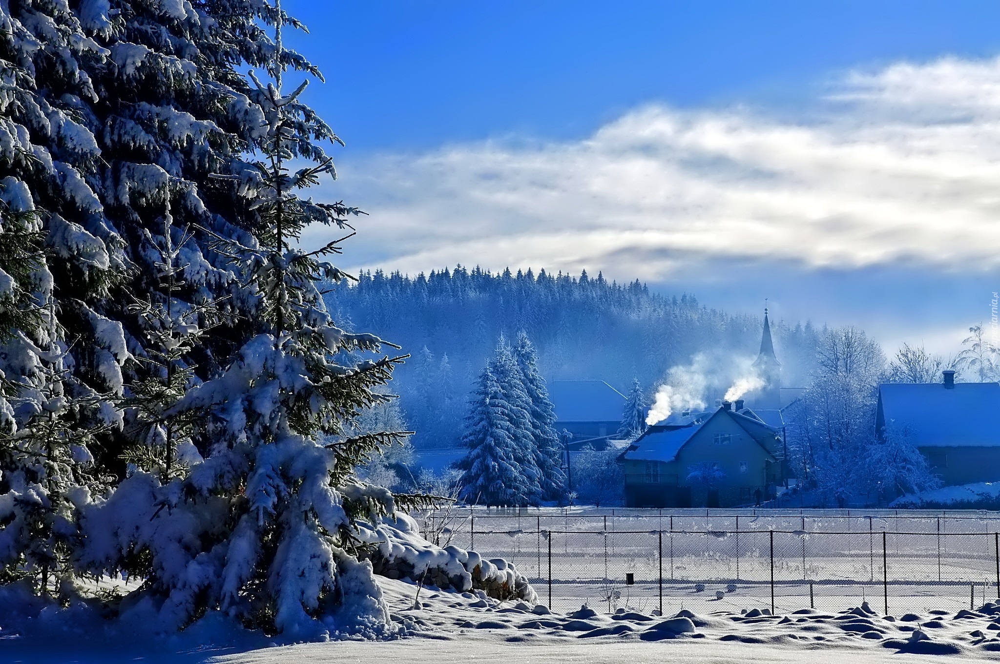 Edytor tapety: Zima, Las, Domy, Wieś, Poranek