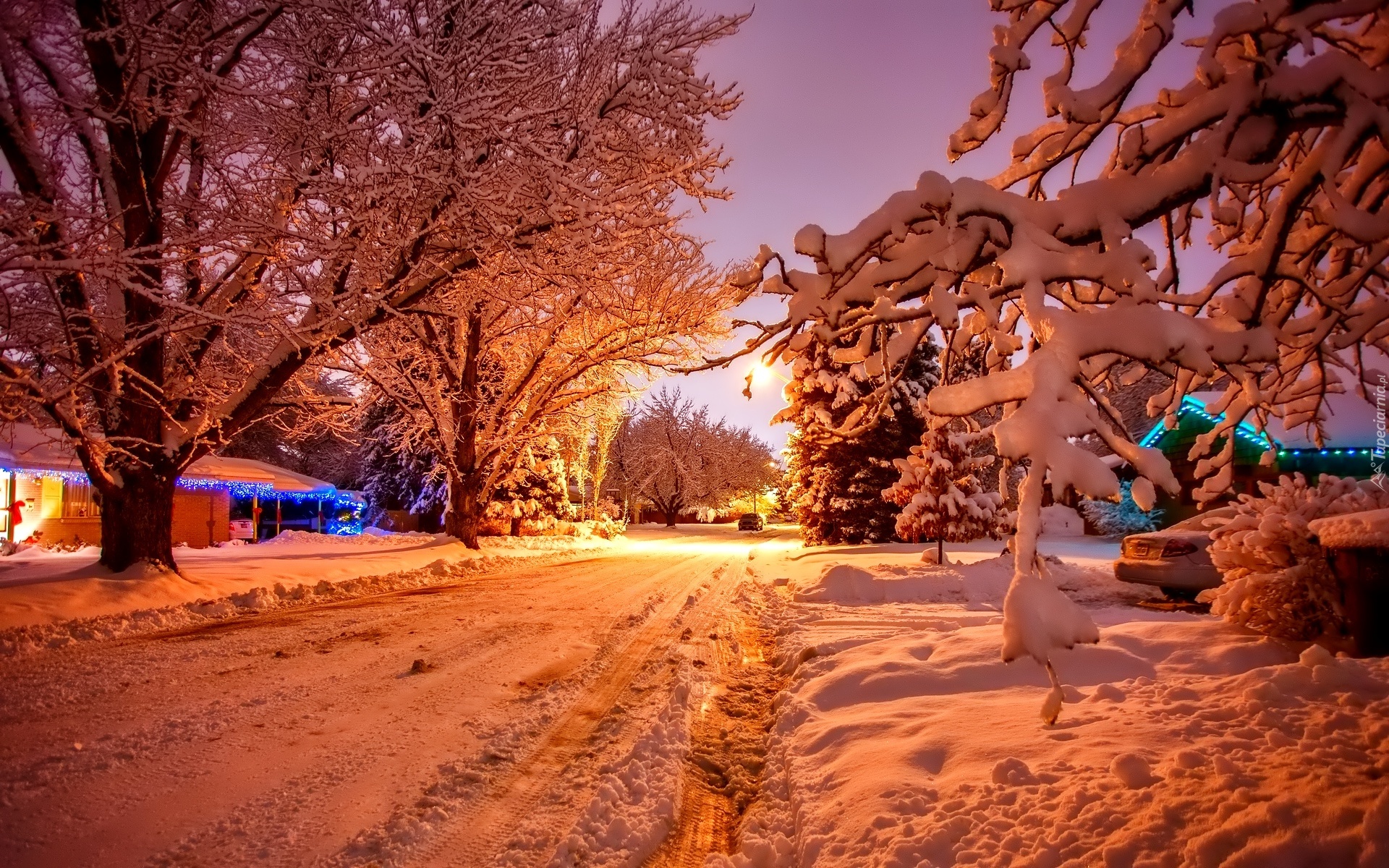 Edytor tapety: Zima, Droga, Zachód Słońca, Ośnieżone, Drzewa