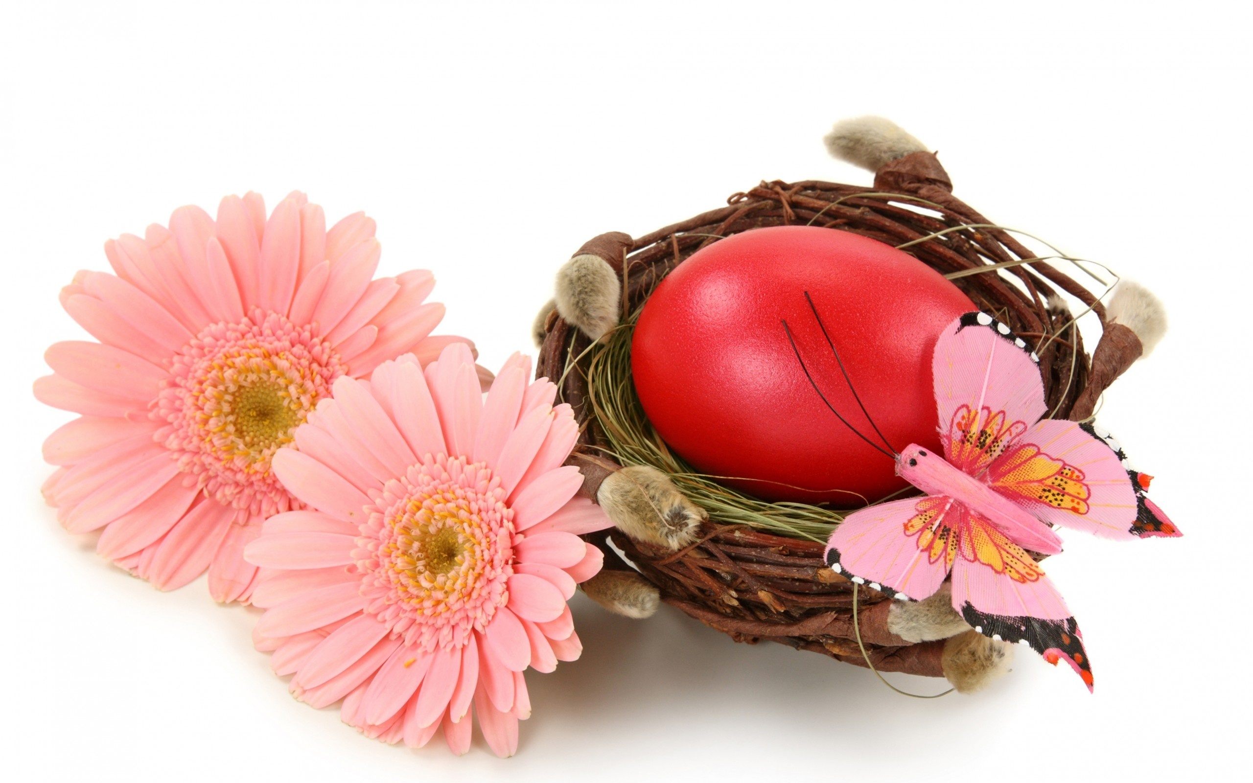 Edytor tapety: Wielkanoc, Gniazdo, Kolorowe, Jajko, Różowe, Gerbery, Motylek