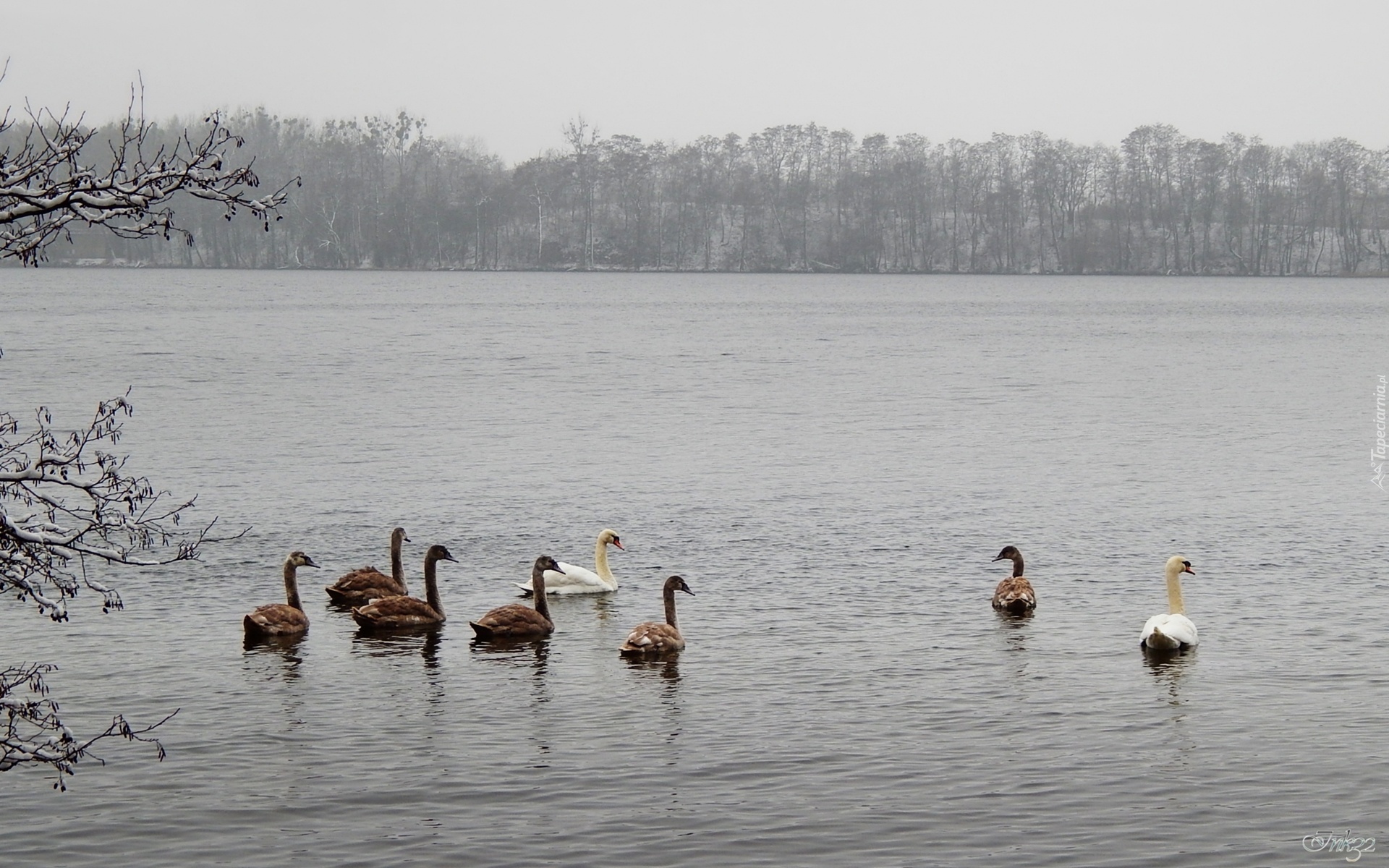 Edytor tapety: Łabędzie, Jezioro, Drzewa