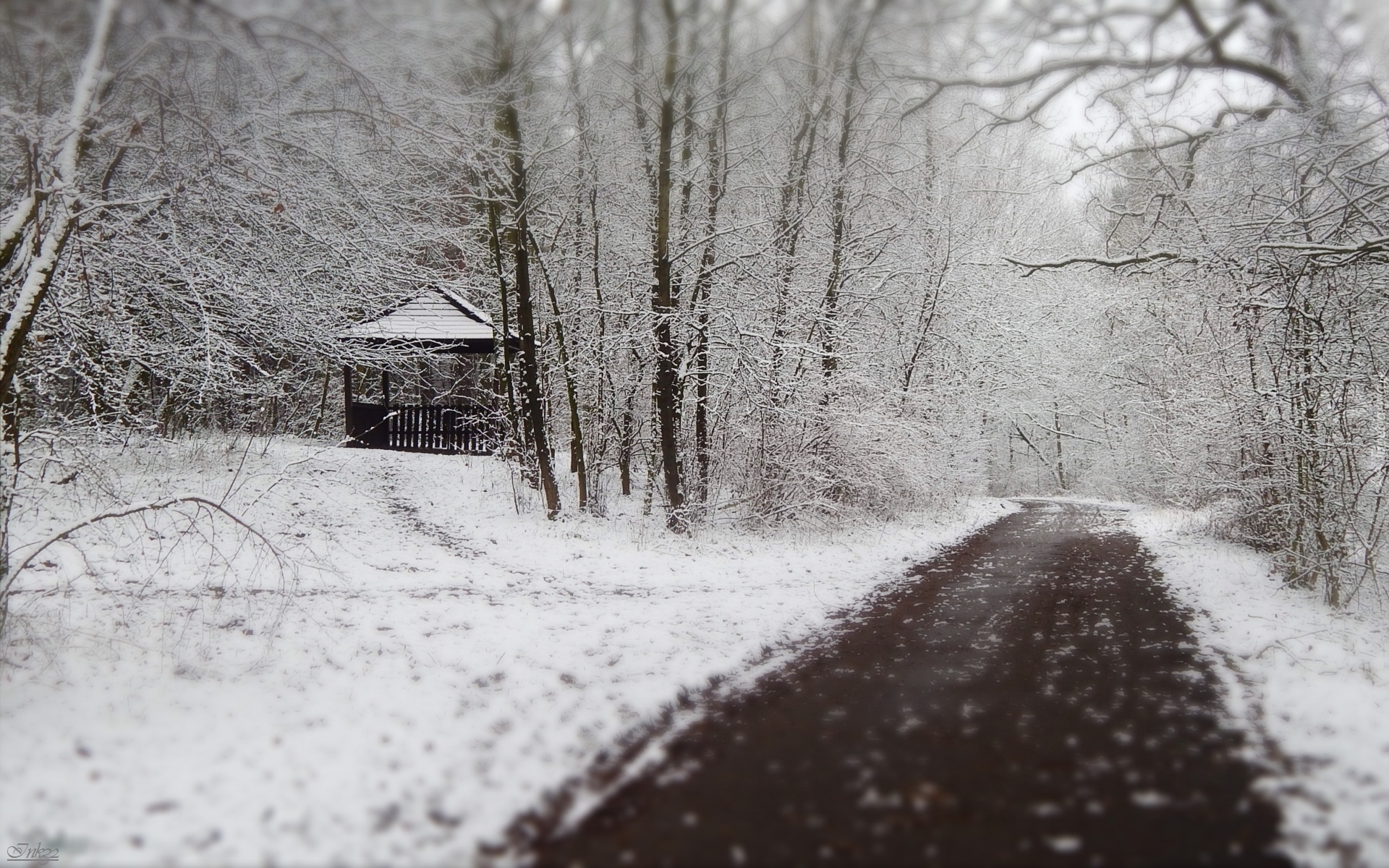 Edytor tapety: Droga, Drzewa, Budka, Śnieg