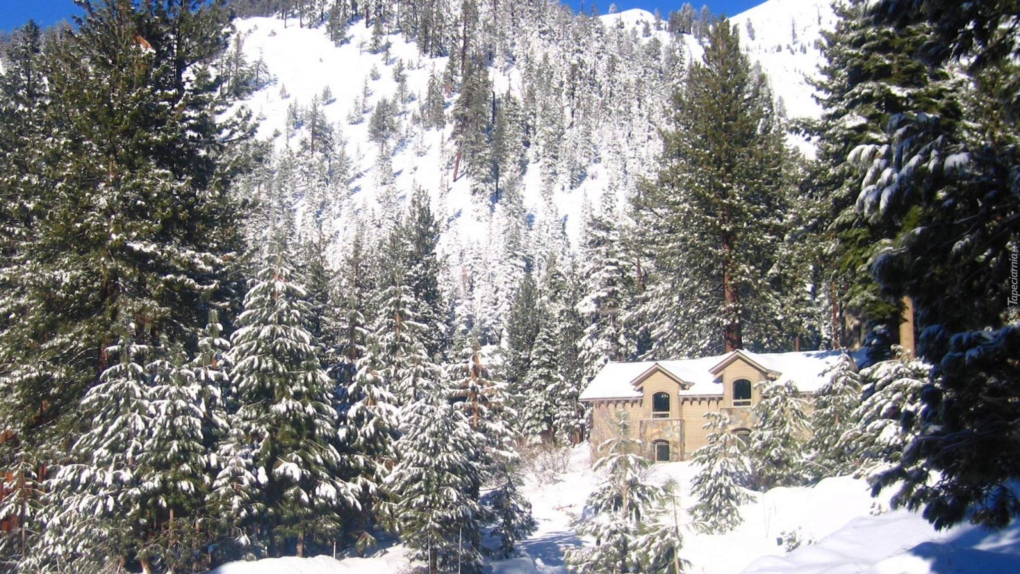 Edytor tapety: Góry, Drzewa, Świerkowe, Śnieg, Dom