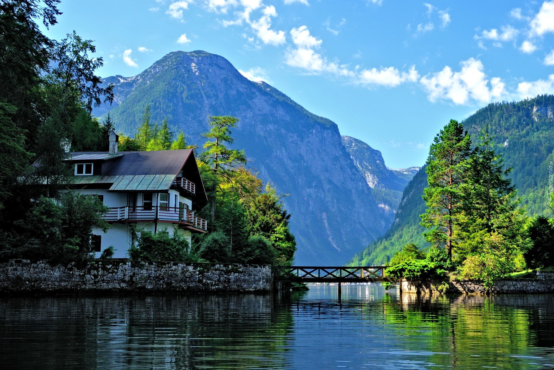 Edytor tapety: Dom, Mostek, Góry, Rzeka