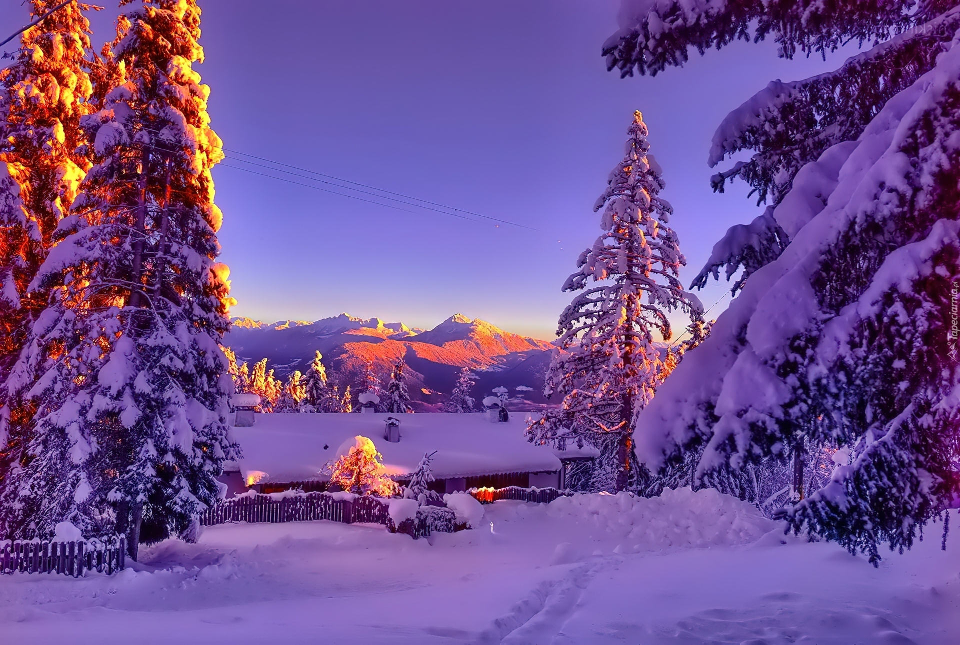 Edytor tapety: Zima, Góry, Lasy, Zachód Słońca