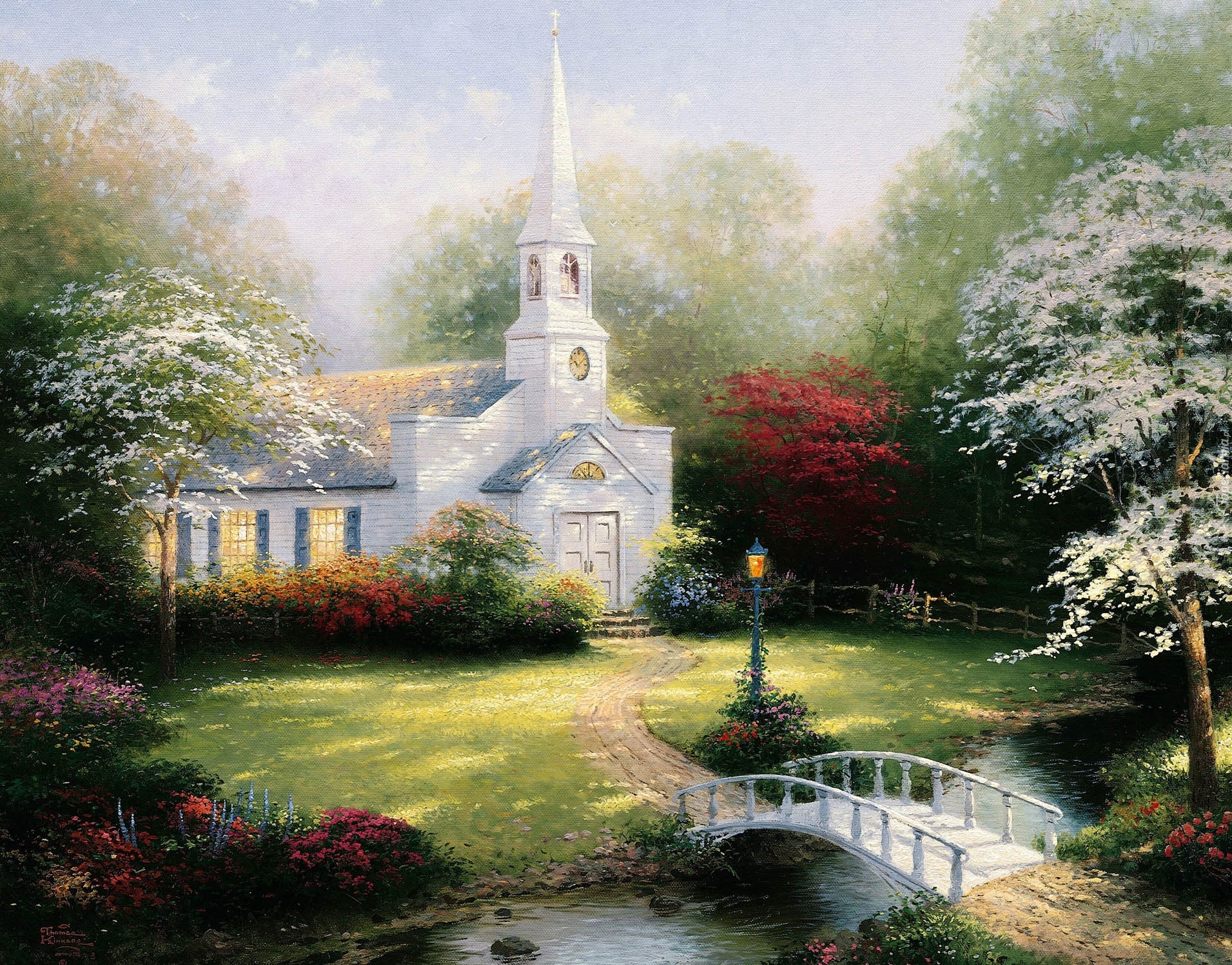 Edytor tapety: Malarstwo, Obraz, Kościół, Rzeka, Mostek, Drzewa, Thomas Kinkade