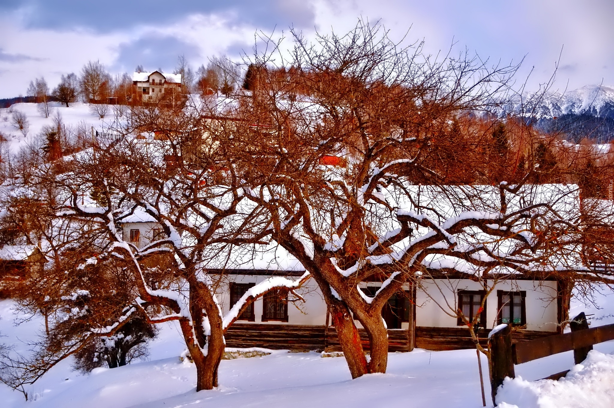 Edytor tapety: Zima, Wiejskie, Domy, Drzewa