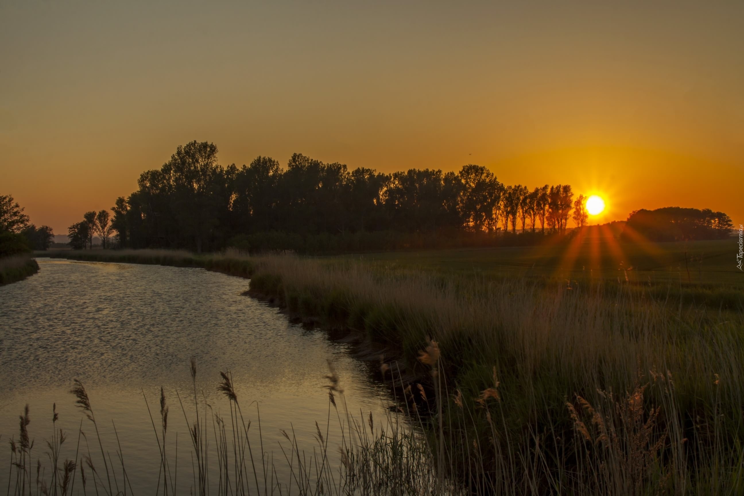 Edytor tapety: Rzeka, Trawy, Drzewa, Łąki, Zachód, Słońca