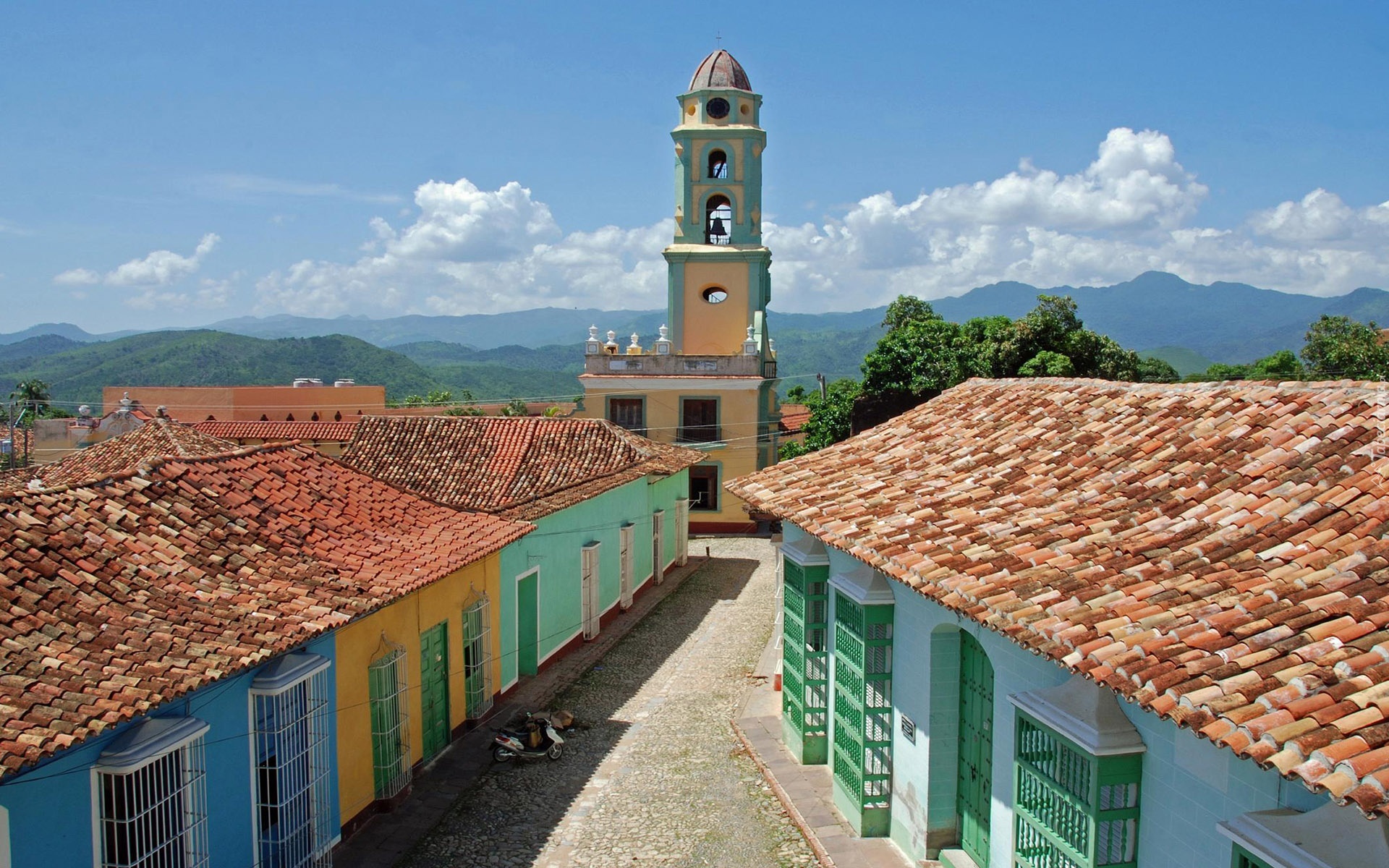 Edytor tapety: Domy, Kościół, Uliczka, Góry, Drzewa