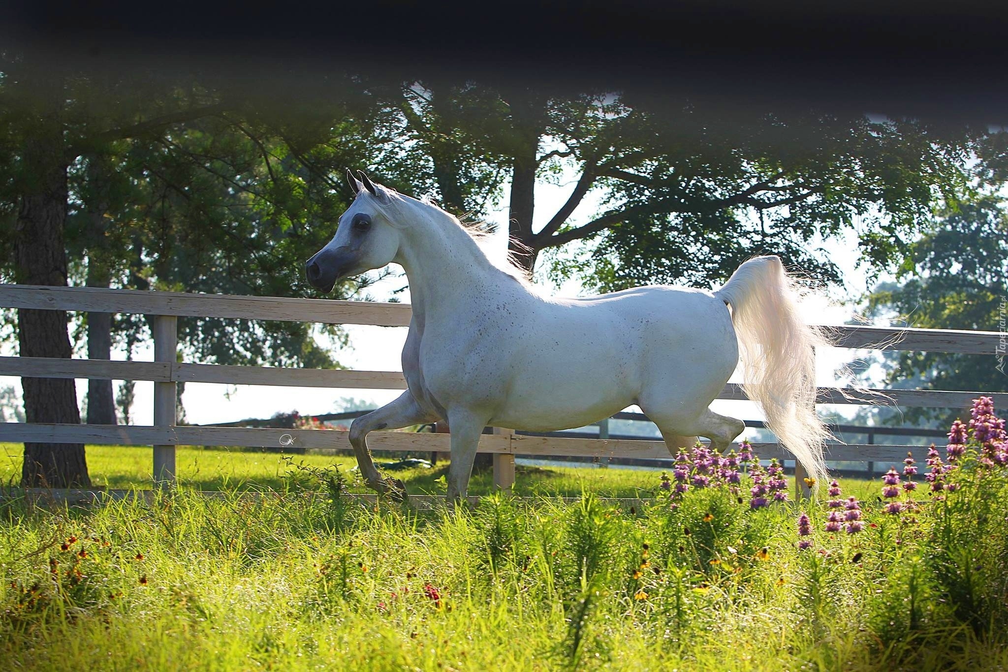 Edytor tapety: Biały, Koń, Ogrodzenie, Zieleń