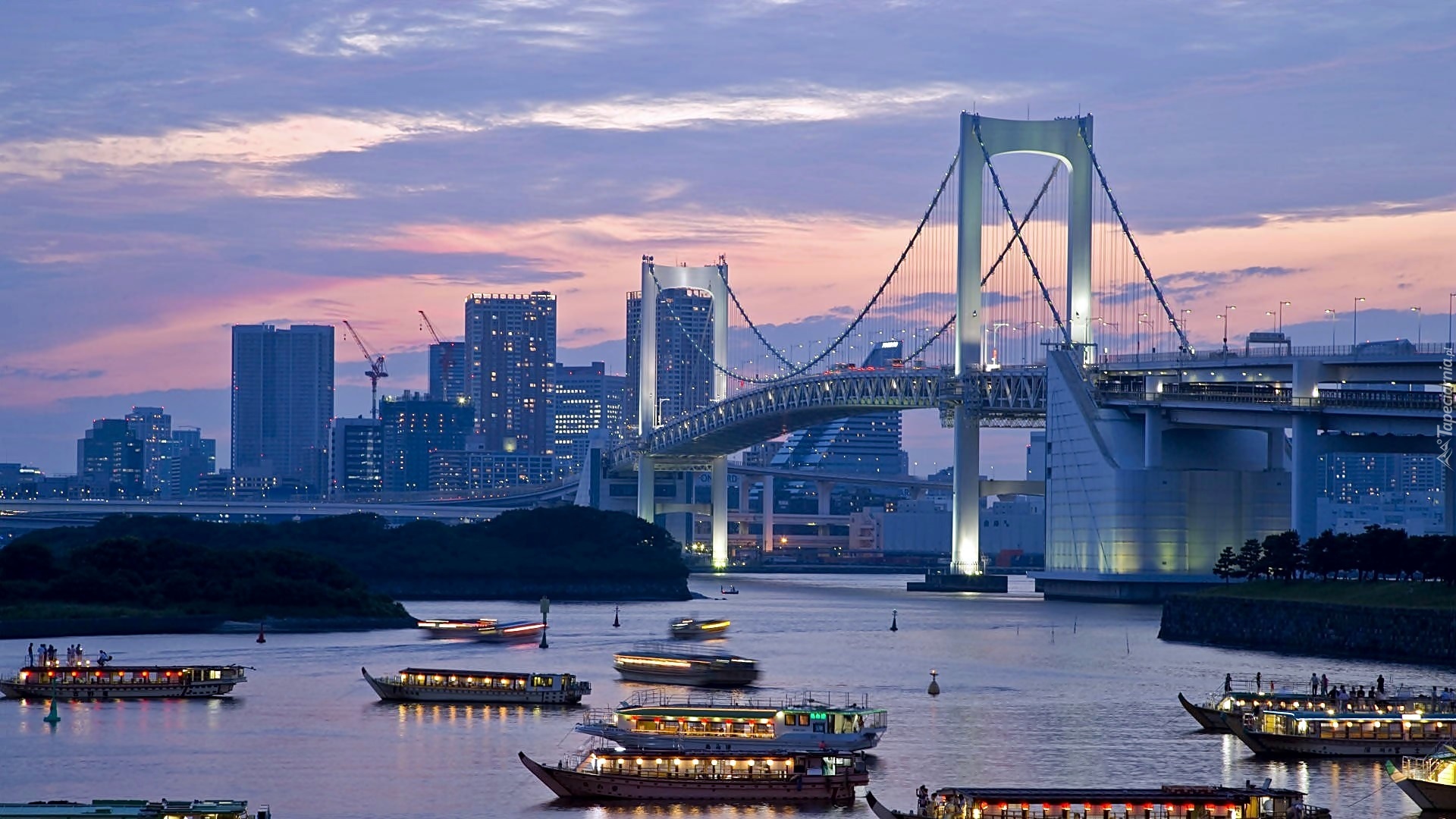 Edytor tapety: Świt, Panorama, Tokio, Most, Morze, Statki