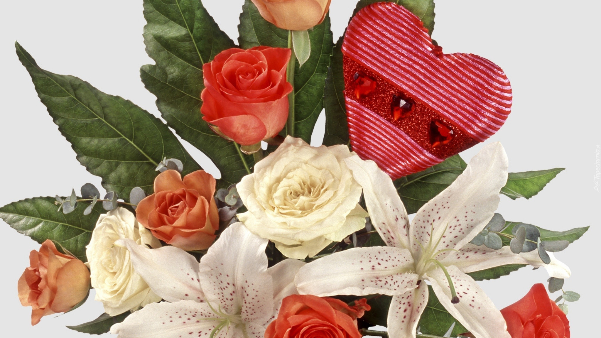 Edytor tapety: Bukiet, Kwiatów, Róże, Lilie, Serce