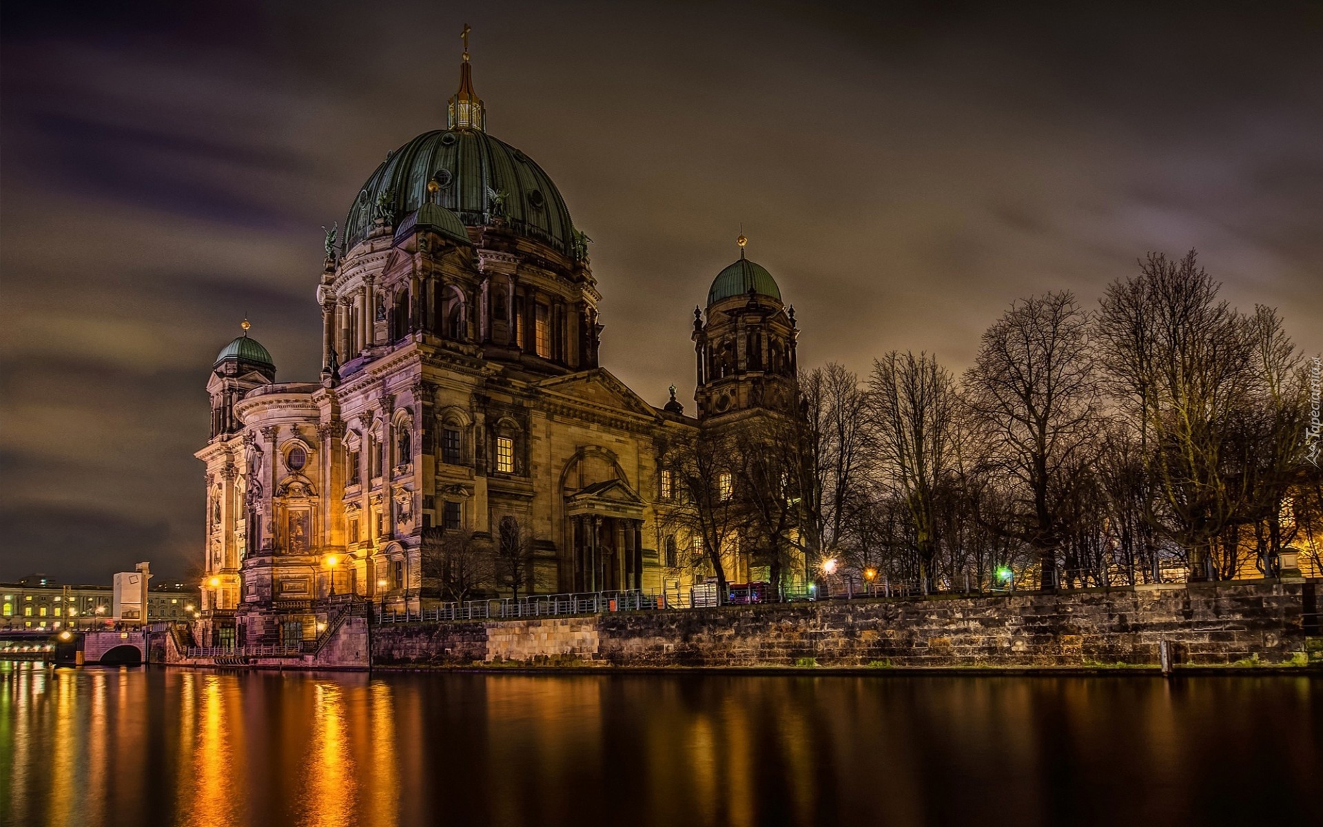 Edytor tapety: Kościół, Parkan, Drzewa, Rzeka, Noc