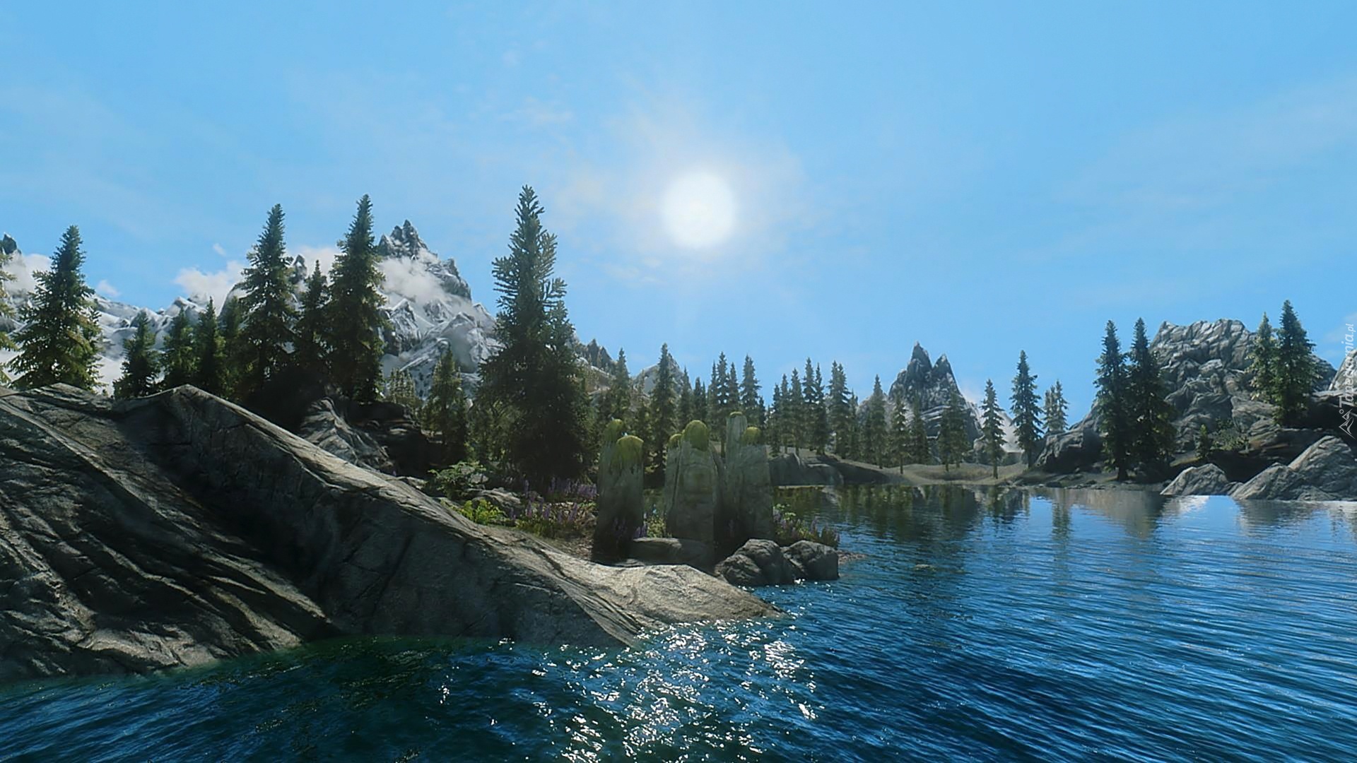 Edytor tapety: Jezioro, Skały, Drzewa, Przebijające, Słońce