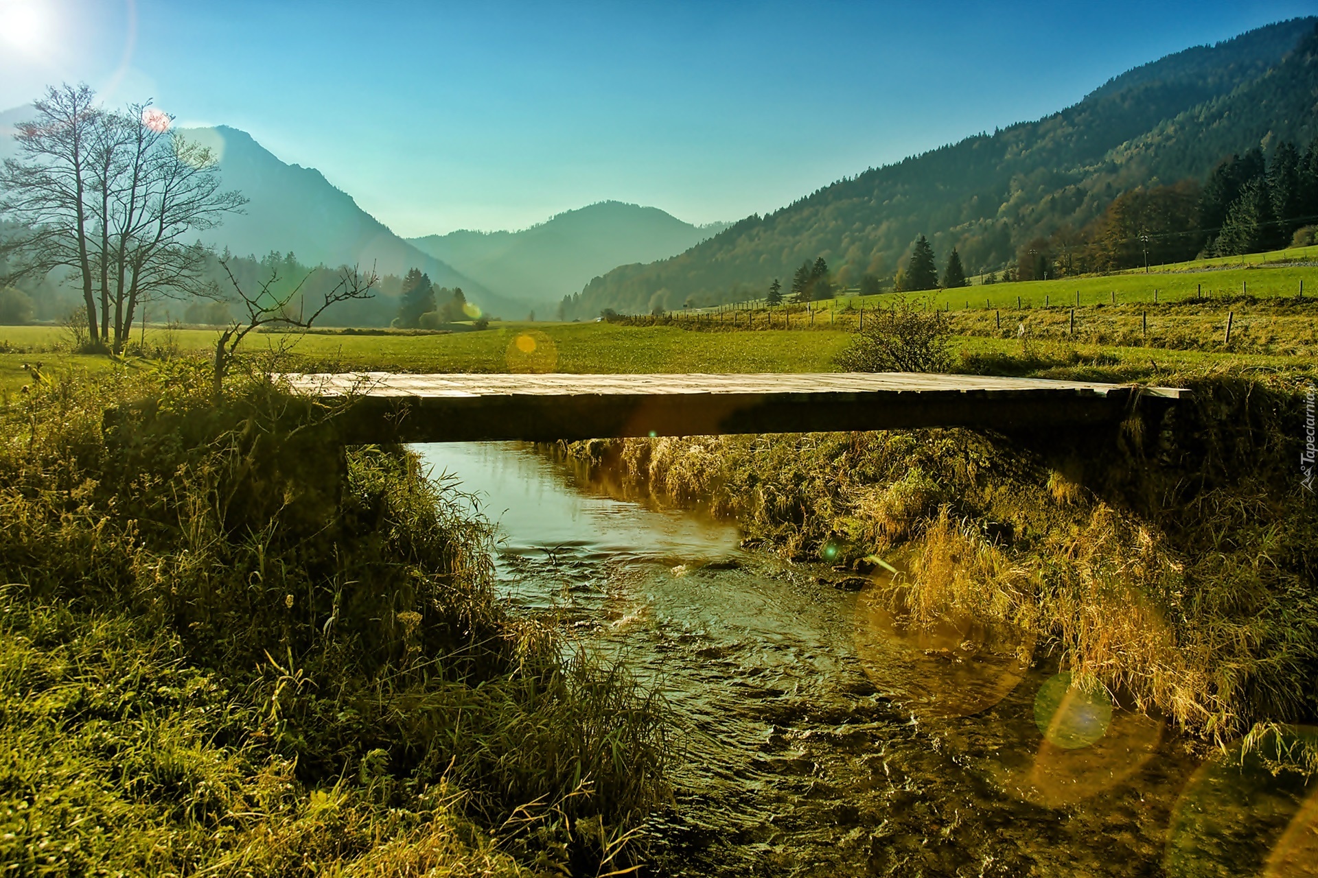 Edytor tapety: Świt, Łąki, Rzeczka, Kładka
